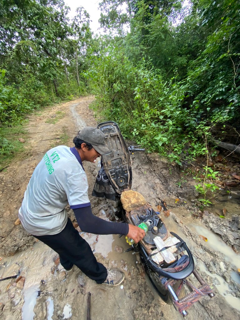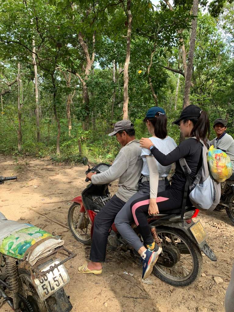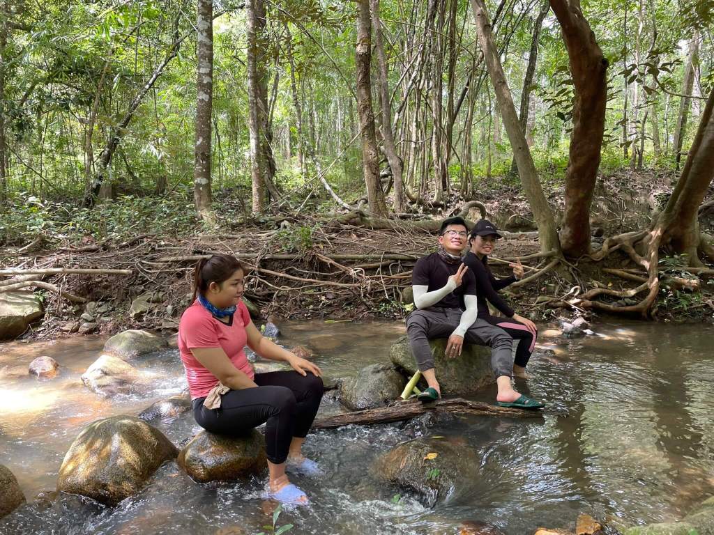 Đi qua khu rừng này là tới bìa rừng, cả nhóm được tham gia du lịch mạo hiểm cuối cùng mang tên: “grab rừng”. Có bao giờ nghĩ là xe có thể chạy chạy qua con suối, qua con dốc, cả mấy con đường sình trong 1 nốt nhạc. 1 lái xe chở 2 người, nói thật là đi xong cảm thấy “hàng họ” dập nát hết. Đâu nghĩ tới đây còn được tận hưởng cảm giác mạnh. Nhìn qua xe đứa bạn còn rầu hơn, xe chở nó bể luôn 1 bánh mà vẫn băng rừng như xe chưa bao giờ bể bánh, thật khâm phục mấy anh lái xe, tay lái này mà đi thi lái xe địa hình chắc Việt Nam sẽ giành giải mang về hết. Sau 10 phút thì cũng ra khỏi cánh rừng và vào nhà người dân tắm rửa. Tới đây thì xem như chuyến đi kết thúc.