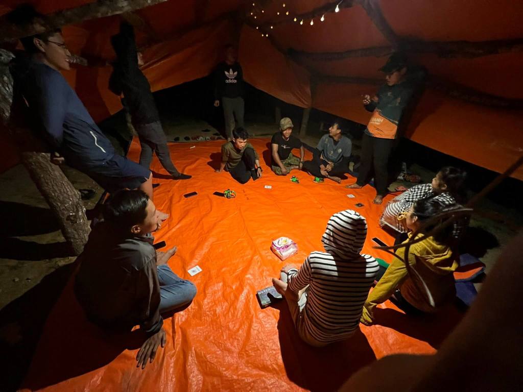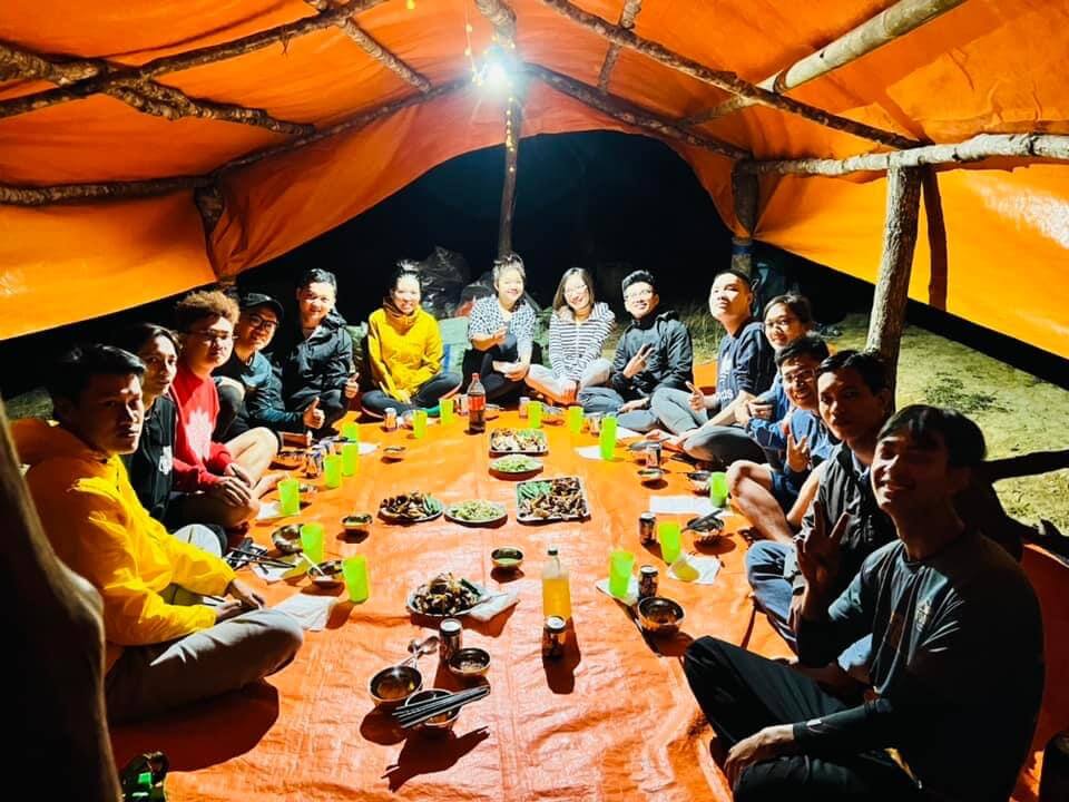 Khoảng 6h hơn thì cả nhóm đã tập trung vòng tròn ngồi dưới lán dựng tạm để chuẩn bị ăn tối. Lán này dựng đơn sơ chỉ có tấm bạt che phía trên cùng, 4 phía không có gì nên gió thổi có độ “sát thương cấp vũ trụ” nó lạnh tê tái. Ăn xong, mọi người ngồi quay quần trò chuyện, giới thiệu làm quen với nhau, sau đó bạn dẫn đoàn chỉ mọi người chơi ma sói để thử thách “sức mạnh tình bạn”, đây cũng là ngọn nguồn của bao nhiêu “hiềm khích”, “dư âm”, “triệu câu hỏi vì sao” kiểu: tại sao mày giết tao, tại sao anh giết em , ủa em tin anh mà, chơi dở quá. Do trời quá lạnh nên mọi người phải về lều ngủ mặc dù rất tiếc nuối khi dừng chơi giữa chừng.