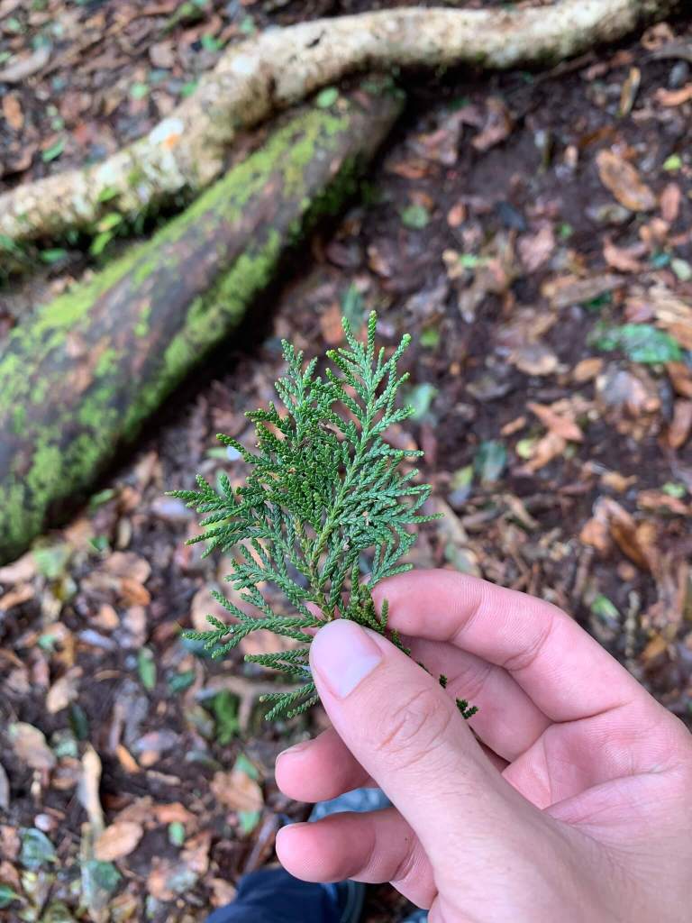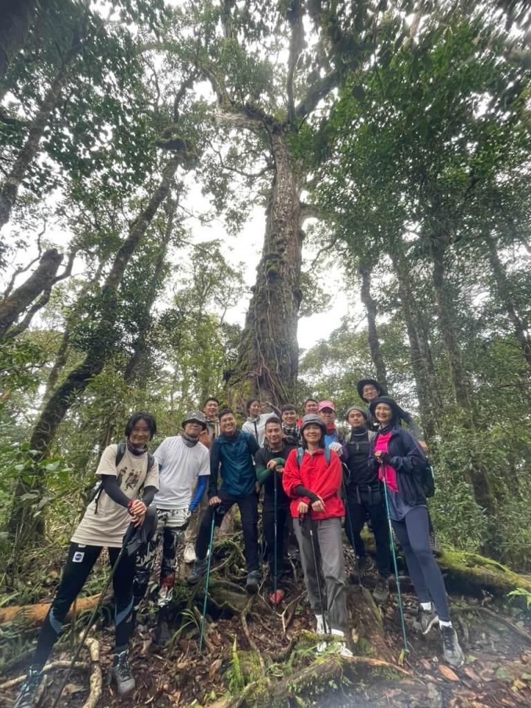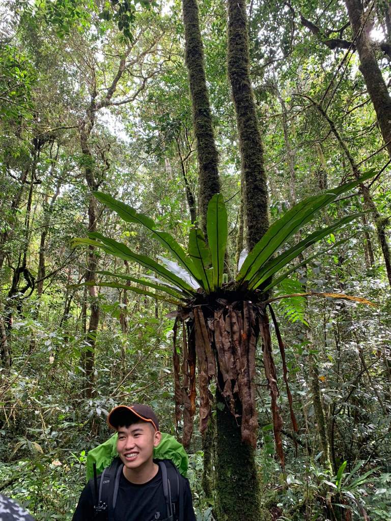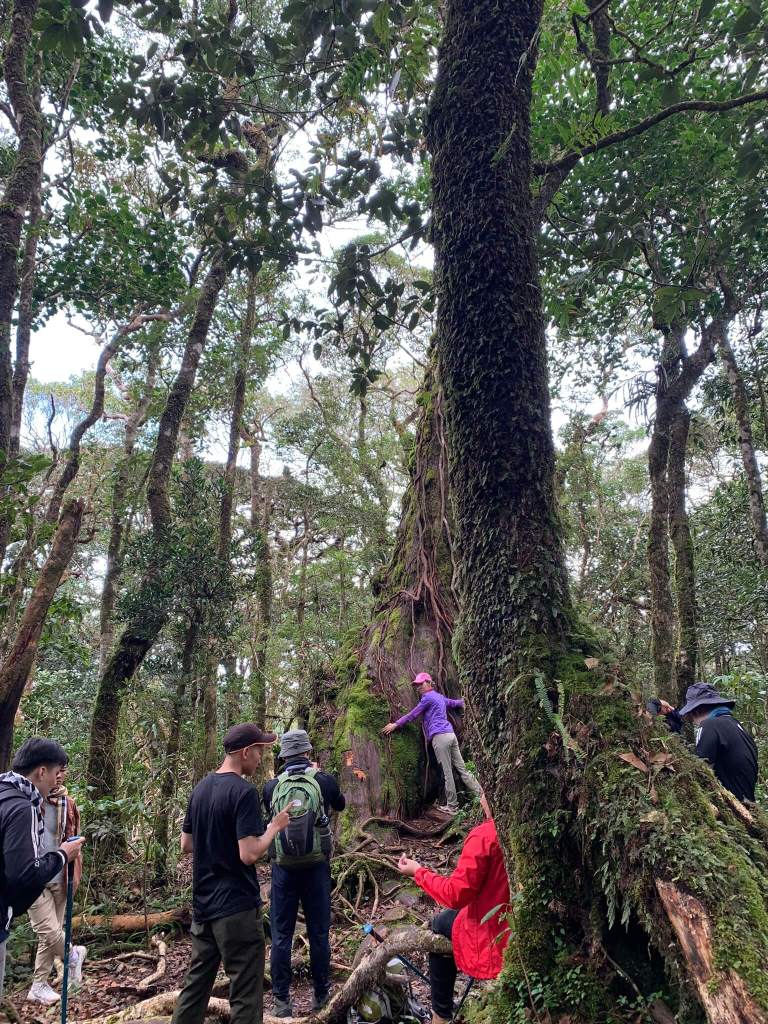 Bạn hướng dẫn đoàn mở lớp học sinh học miễn phí khi đi chút, dừng lại để giới thiệu về các loại cây hai bên đường như thu hải đường, rán ổ phụng, dây quai ba lô, con ếch ma cà rồng bay… sau đó còn ngắt lá đưa ăn thử để cảm nhận mùi vị ra sao. Điểm nhấn con đường lên đỉnh lần này là cây pơ mu 1300 tuổi được công nhận bởi các nhà khoa học Đại học Columbia (Mỹ)