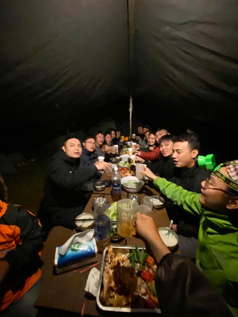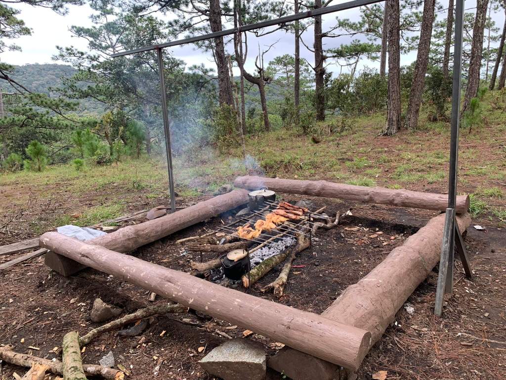 Khu cắm trại nằm trên đồi thông nên càng về đêm thì gió thổi mạnh kèm theo nhiệt độ cũng rơi tự do. Lạnh quá phải ra sưởi kế bên đồng lửa, chỗ mấy anh em đang chuẩn bị đồ ăn tối. Đợi chút cả nhóm ngồi quay quần bên bàn ăn dùng bữa tối, thực đơn khá đơn giản: combo gà và heo nướng, cháo ếch, salad và rượu.