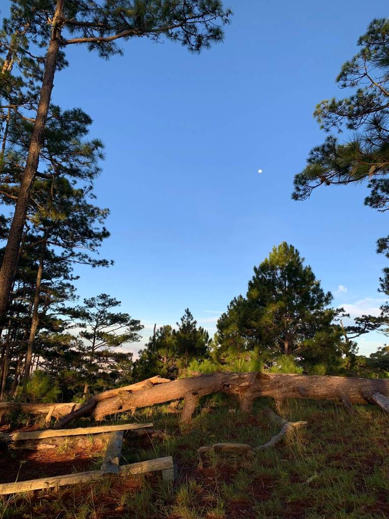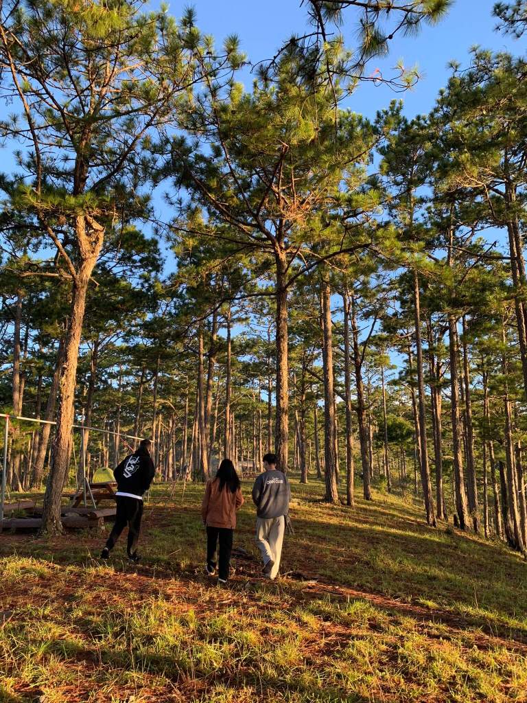 Sáng ra, vệ sinh cá nhân xong là quyết tâm đi đón bình minh. Mình đi về phía con dốc cách chỗ cắm trại khoảng 100m, đưa mắt về phía mặt trời đang mọc thì phát hiện hồ nước rất lớn bên tay phải. Nắng sớm màu vàng nhạt xuyên qua đồi thông làm mọi thứ bừng sáng, đẹp đến lạ lùng.