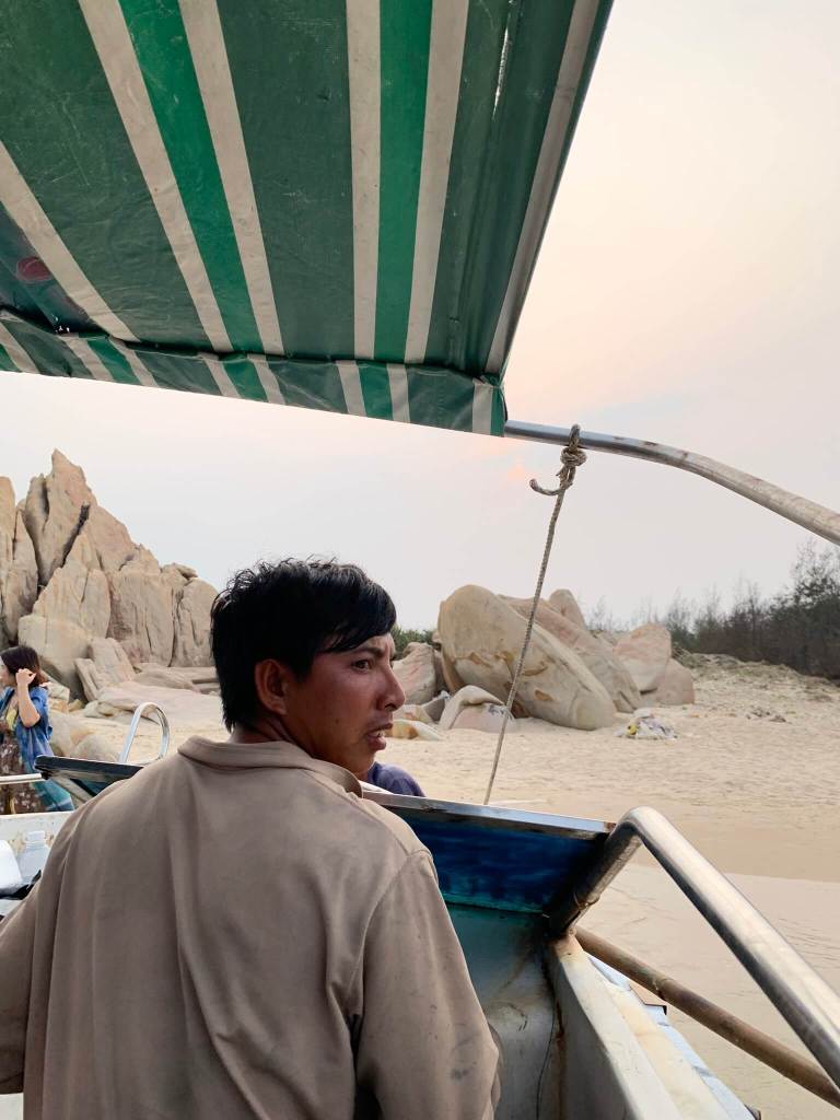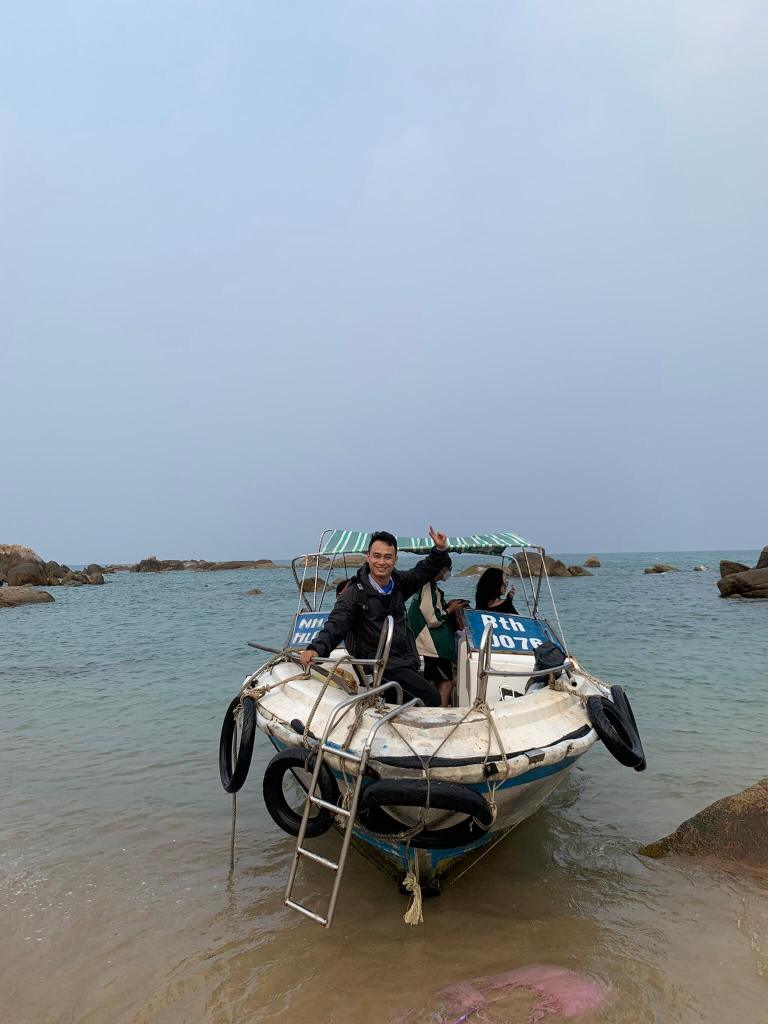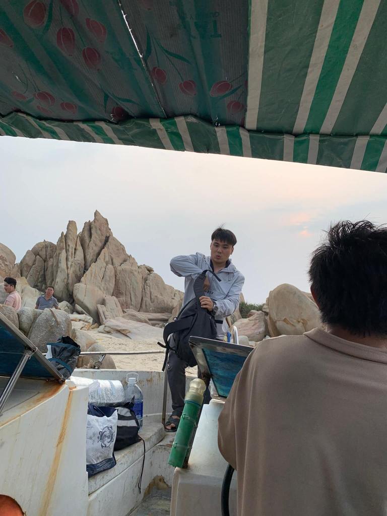 Khoảng hơn 4h30 thì nhóm đã tới được Kê Gà, Hàm Thuận Nam, Bình Thuận. Loay hoay tìm cano để ra đảo thì chạy nhầm vào hẻm đang xây dựng quán cà phê view biển khá đẹp, thấy mấy đứa tội nghiệp nên chị lên xe dẫn cả đám qua chỗ có cano đi qua đảo, kèm theo dịch vụ giữ xe luôn. Gần 5h thì đã chính thức lên đảo Kê Gà.