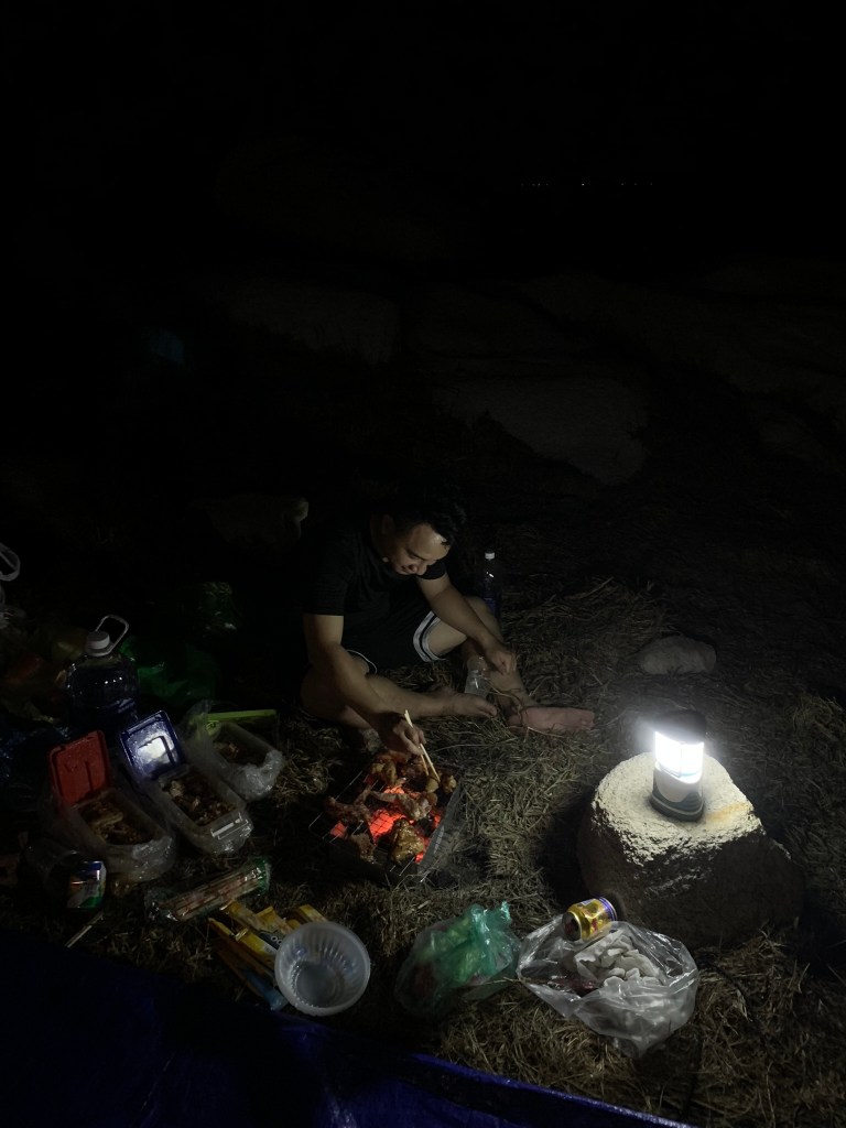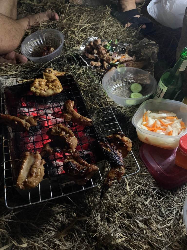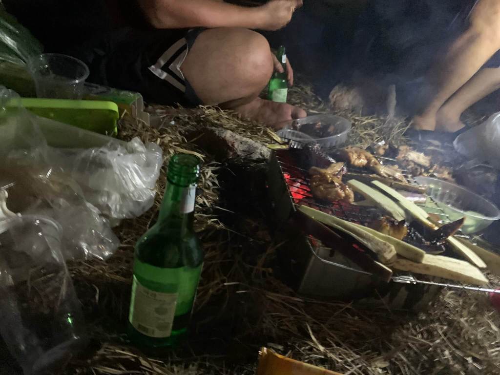 Sau khi dựng lều xong thì bắt đầu để than vào khè lửa để nướng gà, thịt ăn tối kèm theo trái cây, rượu soju.