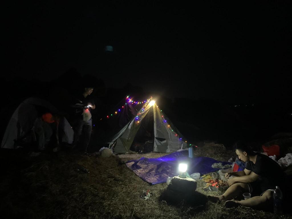 Nhóm mình mang theo 2 cái lều tưởng dựng lên đơn giản nhưng không cũng mất gần 20 phút. Dựng lều đủ vững để ngủ thôi, không quá đẹp, nhưng tạo nét bằng 2 dây đèn chú Tân mua theo nhìn cũng chill phết…