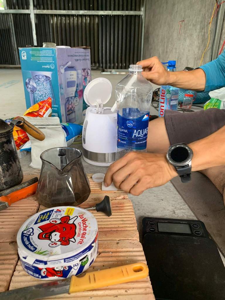 Vừa tới thì cũng là lúc mẹ Cường đang làm đồ ăn cho tụi heo, Cường lấy cái thang để đi lên gác, nghe nói đây là cứ điểm của ảnh. Chú bắt đầu lấy rất nhiều dụng cụ dùng pha cà phê, nào là nhiệt kế, ấm nước, phễu, cân điện tử…rồi có thêm muối hồng, nước suối ion…