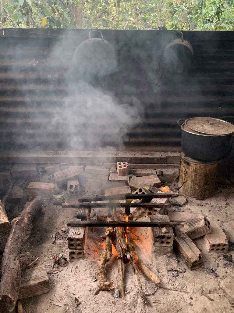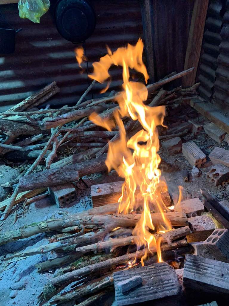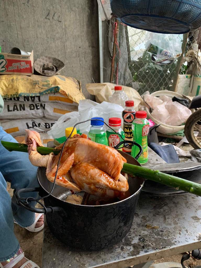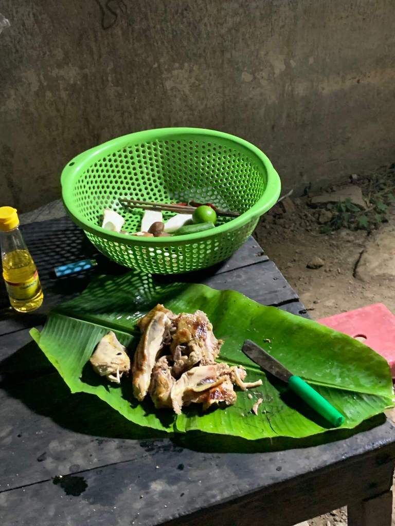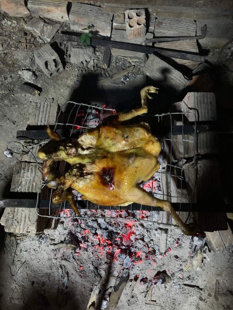 Mới biết nhau mà 3 người nói chuyện với nhau có vẻ hợp mấy tiếng đồng hồ chưa hết chuyện, khoảng hơn 5h thì mẹ chú Cường làm con gà trong rẫy (tao xin lỗi mày vì tụi tao tới mà mày ra đi), do không có xiên sẵn nên chủ nhà chặt cái cây đâm từ đít lên đầu. Dù vậy vẫn chưa ok với cái kích cỡ của bếp đang chờ củi cháy hết, nên chú lấy kẽm trong nhà đan lại làm vỉ nướng luôn.