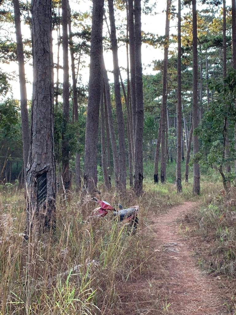Sau đó, chú Cường nói mình với chị dắt cái xe về rẫy để chú siết cái ống dẫn xăng lại. Sau đó là hơn 1 tiếng loay hoay tìm xe sau đó tìm đường về rẫy của 2 chị em. Vị trí quăng xe không nhớ, 2 chị em tìm hoài không thấy. Cuối cùng cũng tìm thấy nhưng đường về rẫy ở đâu thì không biết, chi Anh chỉ vào con đường chắc như đinh nó là câu trả lời cuối cùng. Nhưng lạ lắm, đi được chút chị cảm giác là sai đường nên chị một mình đi ngược lên. Hơn 10 phút sau, chị lạc luôn mình, mình đẩy chiếc xe lên con dốc hướng lại đồi thông, bắt đầu cọc. Vầng, 2 người không gặp nhau là do chị đi đường kế bên, con đường có dây điện. Rẫy này là rẫy duy nhất có đường dây điện dẫn vào.