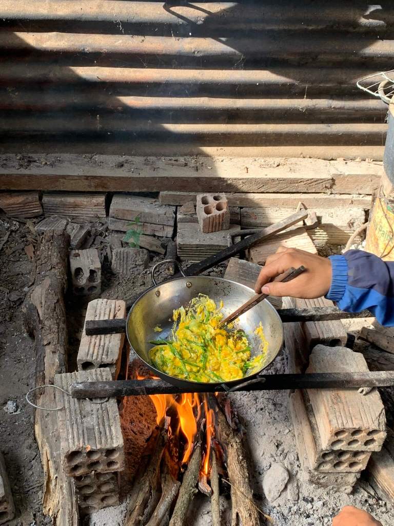 Gần 8h thì cũng quay lại rẫy chú Cường, đi làm đồ ăn sáng luôn. Do quên mua dầu ăn hôm qua, mọi người lấy mỡ gà, da gà làm dầu sau đó đập trứng vào chiên, ăn chung với bánh sandwich và chuối. Ăn xong Cường chạy đi mua đồ vì ở rẫy không có đủ đồ để sửa xe, tiện thể chở luôn 1 con heo mọi trong rẫy ra chỗ mổ và gửi khách luôn. Khoảng hơn 11h hơn thì ống dẫn xăng cũng nối lại với nhau, chị Anh đùa chú Cường, chú làm thợ Đụng, “Đụng Đâu Làm Đó”, cái gì cũng biết. Chú Cường mới chêm thêm câu: “Biết quá nhiều nên mới dở”. Mình nghe thôi chứ không biết nói gì thêm mà công nhận chú Cường giỏi.