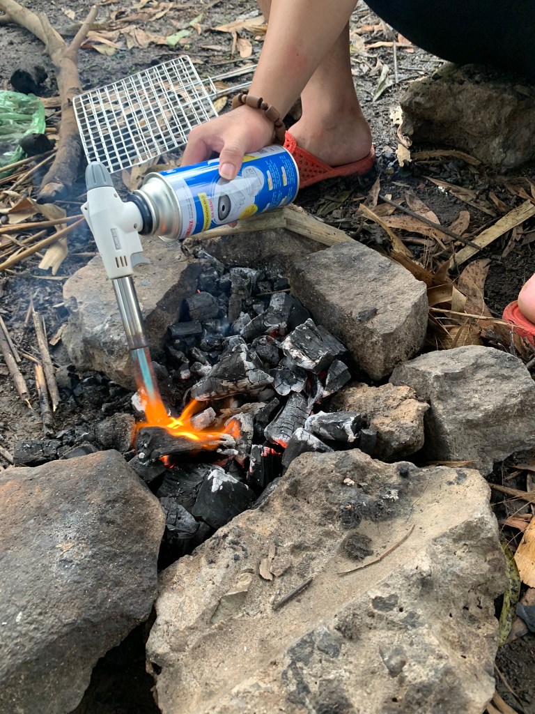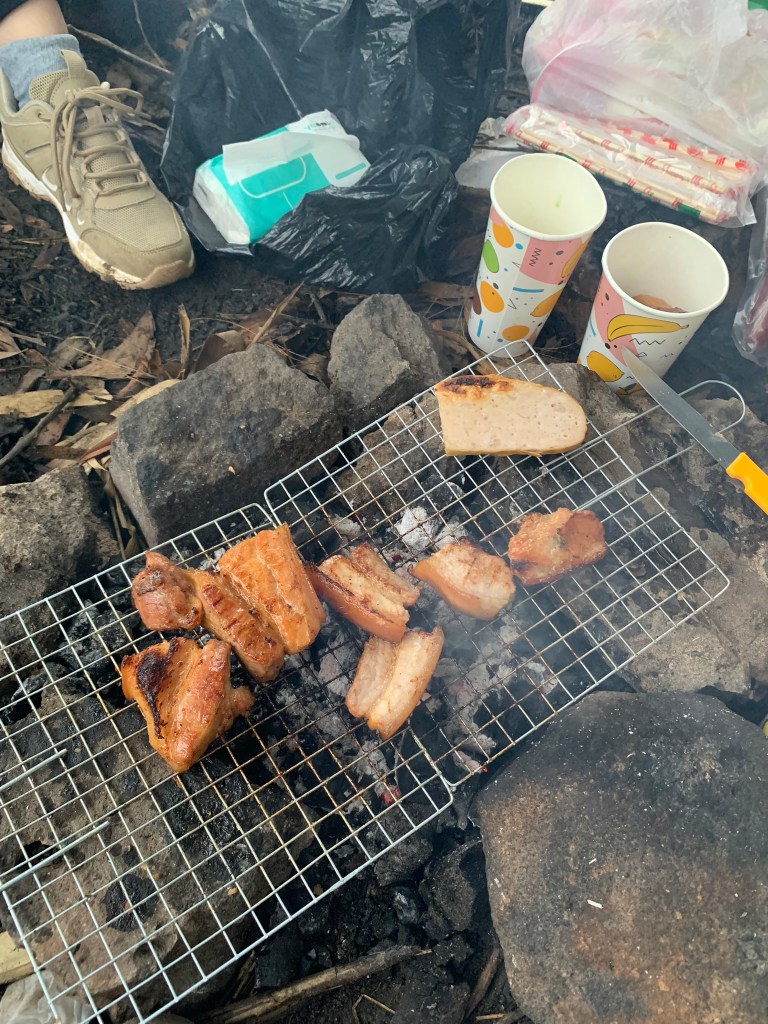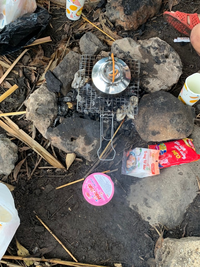 Chuyện gói cà phê: Chú Tân phát hiện quên mang cà phê, quay hỏi 3 người trong nhóm có ai mang không, ai cũng lắc đầu. Nên cử mình đi “xin”, mình ngại nên chuyển thành mang đồ ăn đi trao đổi. Đầu tiên mình mang nửa bịch lạp xưởng còn lại mang qua nhóm 3 cái lều đổi cà phê nhưng đổi lại ly rượu vang đỏ, lỡ rồi thì mình hy sinh uống hết luôn. Nhóm thứ 2 gồm 7-8 chú đang ngồi nướng thịt và cơm lam, mình mang theo thịt nướng qua trao đổi thì các chú cũng không có cà phê mà đưa mình ly rượu rót ra từ chai có dán hình con hươu màu xanh hiệu cũng tây tây dữ lắm, mình cũng uống luôn. Giờ chỉ còn lại nhóm 4 người đang dựng lều bên kia, vừa thấy dựng lều xong, qua đổi bằng cái ly chứa thịt và lạp xưởng vừa nướng xong, nhóm này cũng lắc đầu. Vậy sáng không ai uống cà phê cho tỉnh hả ta. Thấy 4 đứa cực khổ sau đó có bạn đi mua nước chỗ mấy chú bộ đội KS11 mua luôn mấy gói cà phê hòa tan cho tụi mình, lát sau, có bạn qua cho cơm lam và thịt gà nữa. Mặc dù “cho đi có mục đích, đổi chác rõ ràng” nhưng lòng vẫn ấm và cuộc đời bỗng đẹp.