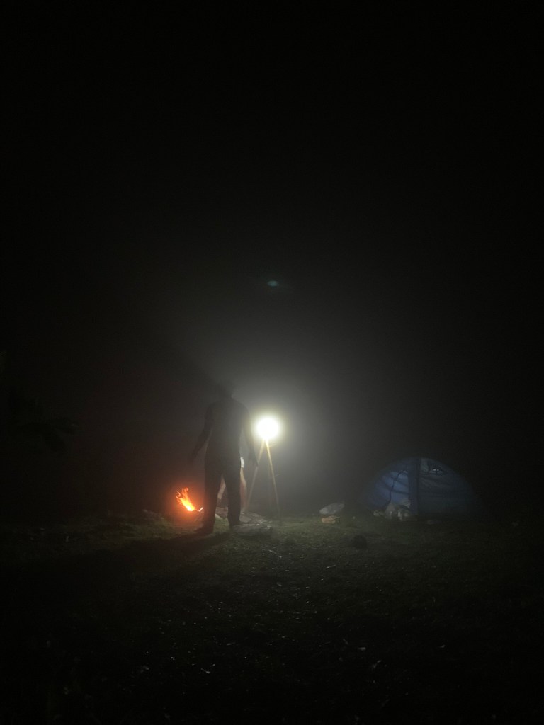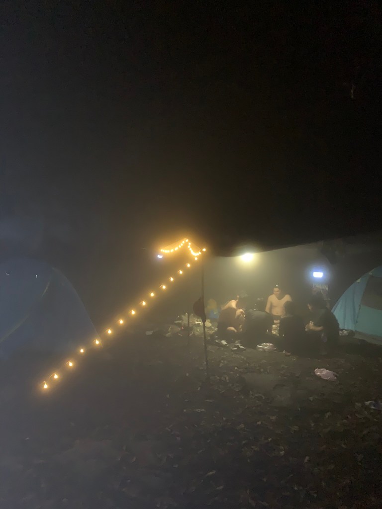 Càng về khuya cả khu trại chìm trong mây, nước trong đám mây va vào lá cây rơi xuống cứ tưởng trời mưa. Còn tầm mắt thì chỉ nhìn thấy trong khoảng 2m thôi, phía xa chỉ nhìn thấy đèn le lói thôi. Có một điều là càng về đêm người đi tìm chỗ hạ trại càng nhiều, hỏi mới biết mọi người leo đêm cũng khá nhiều, khoảng 9h-10h đêm vẫn nghe tiếng bước chân đi xung quanh. Đỉnh Chứa Chan không im lặng như mình nghĩ, ước tính phải hơn 100 người trên đỉnh tối nay.