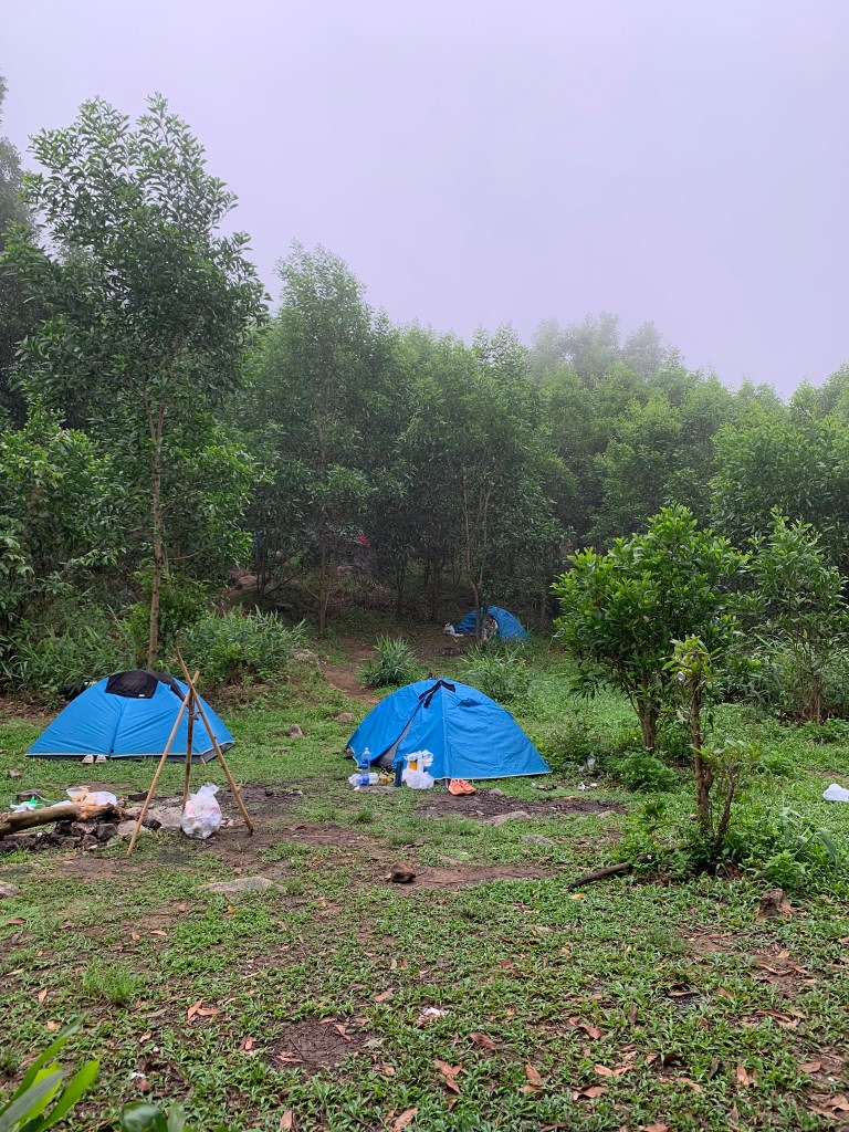 Hai anh em đi xung quanh tìm vị trí dựng lều, lôi kéo cặp đôi kia dựng lều kế bên cho vui, còn 3 thanh niên kia thì đi xa hơn, qua cột mốc tới chỗ rừng tre trúc dựng trại, họ muốn nhìn thấy view đường xá nhà cửa bên dưới về đêm sẽ lung linh như thế nào.