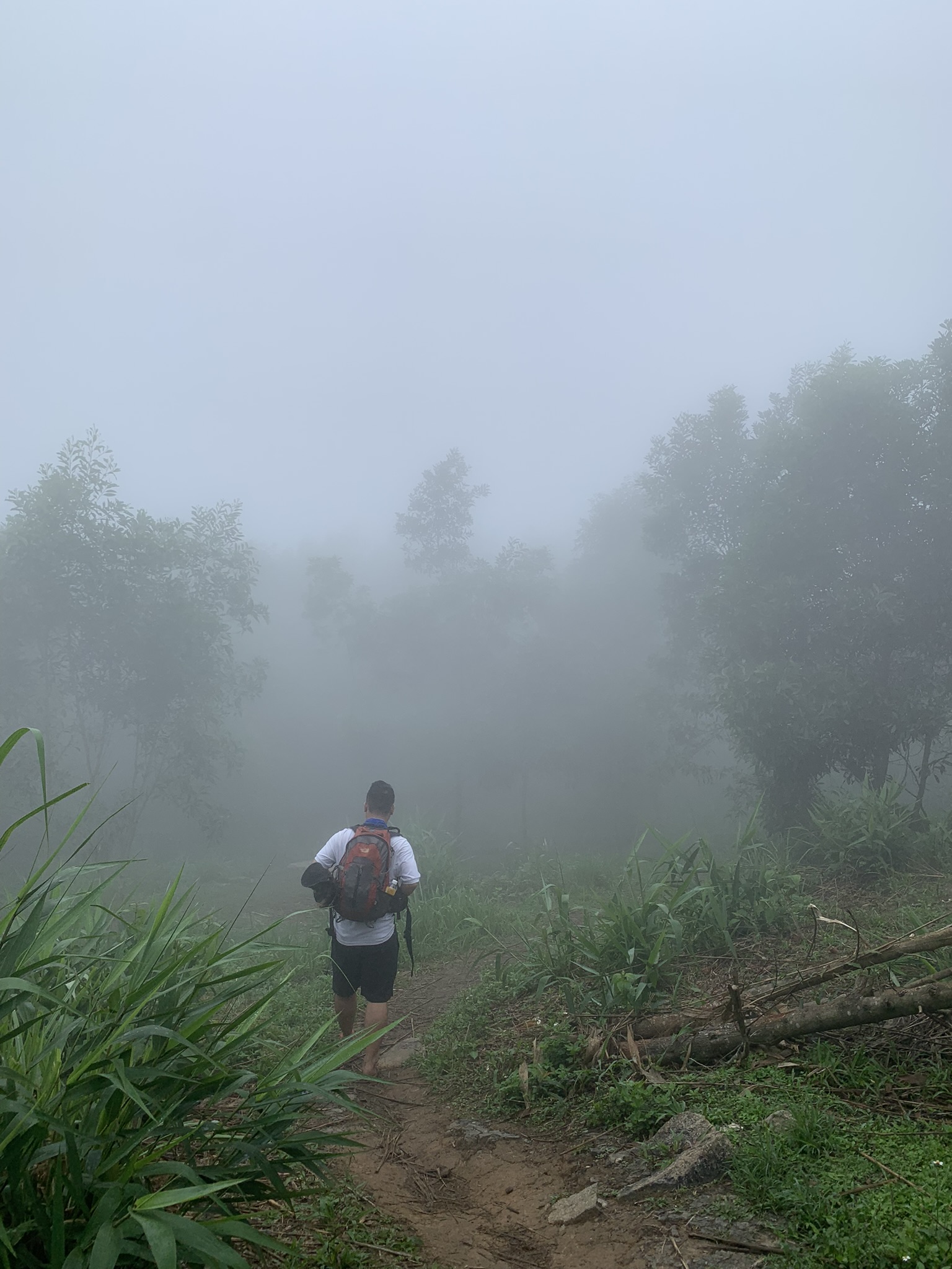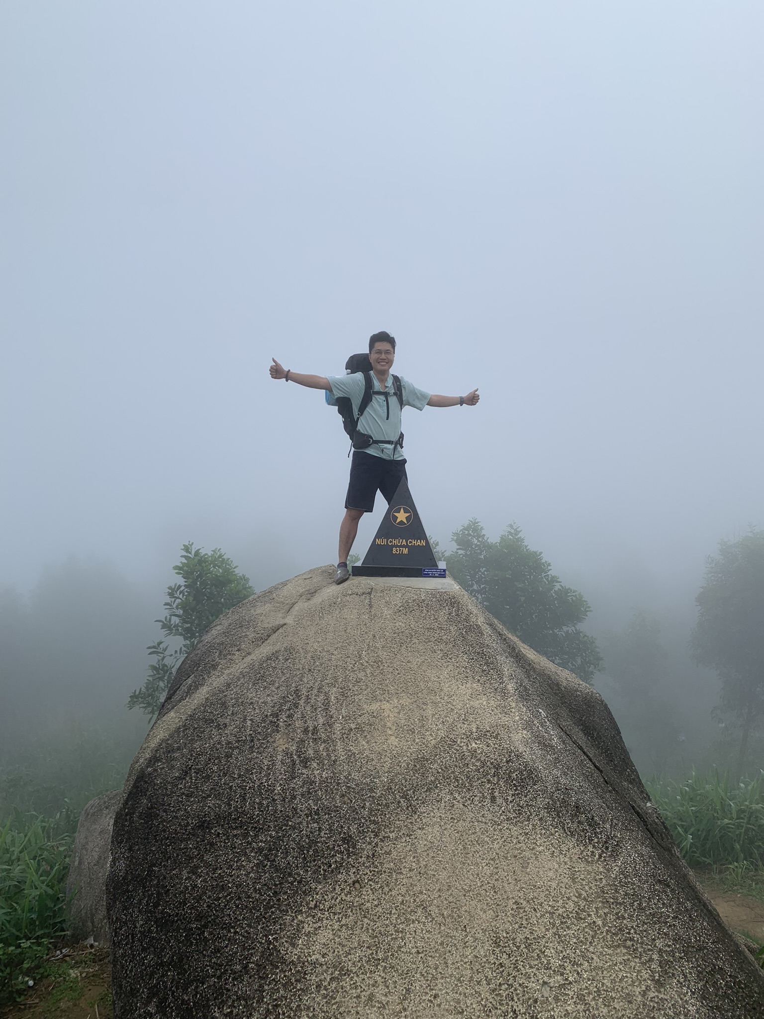 Một đêm trên đỉnh cũng qua, sáng ra trời trong xanh, đun ấm nước nấu mì ăn, dọn dẹp thu lều gấp gọn vào ba lô. Gần 8h sương mù một lần nữa đưa mọi thứ chìm trong mờ ảo. Đi một chút thì tới cột mốc đánh dấu đô cao núi Chứa Chan, chụp vài bức làm kỉ niệm sau đó men theo lối mòn để đi xuống Chùa.