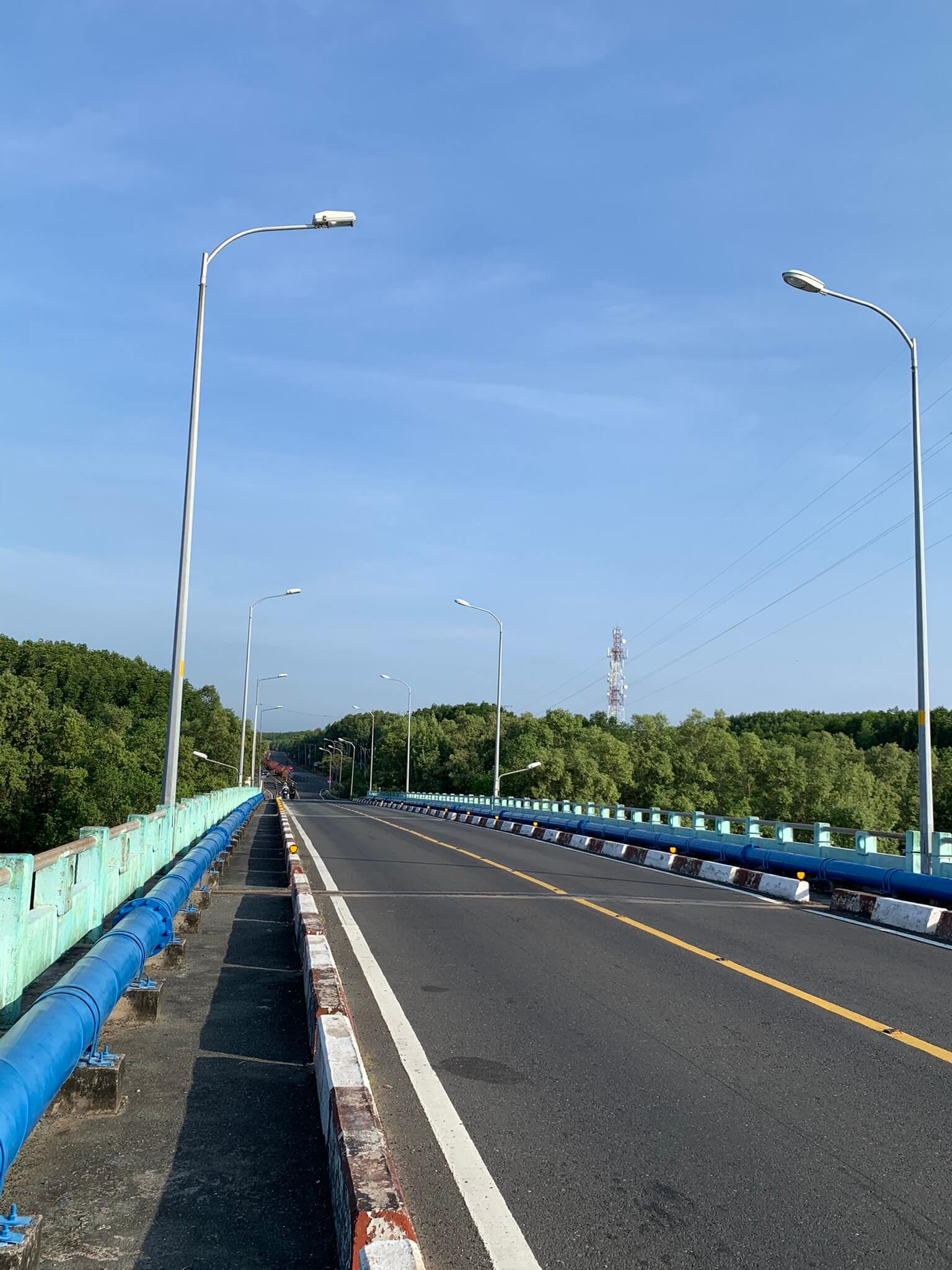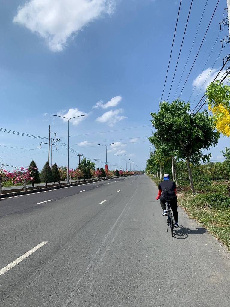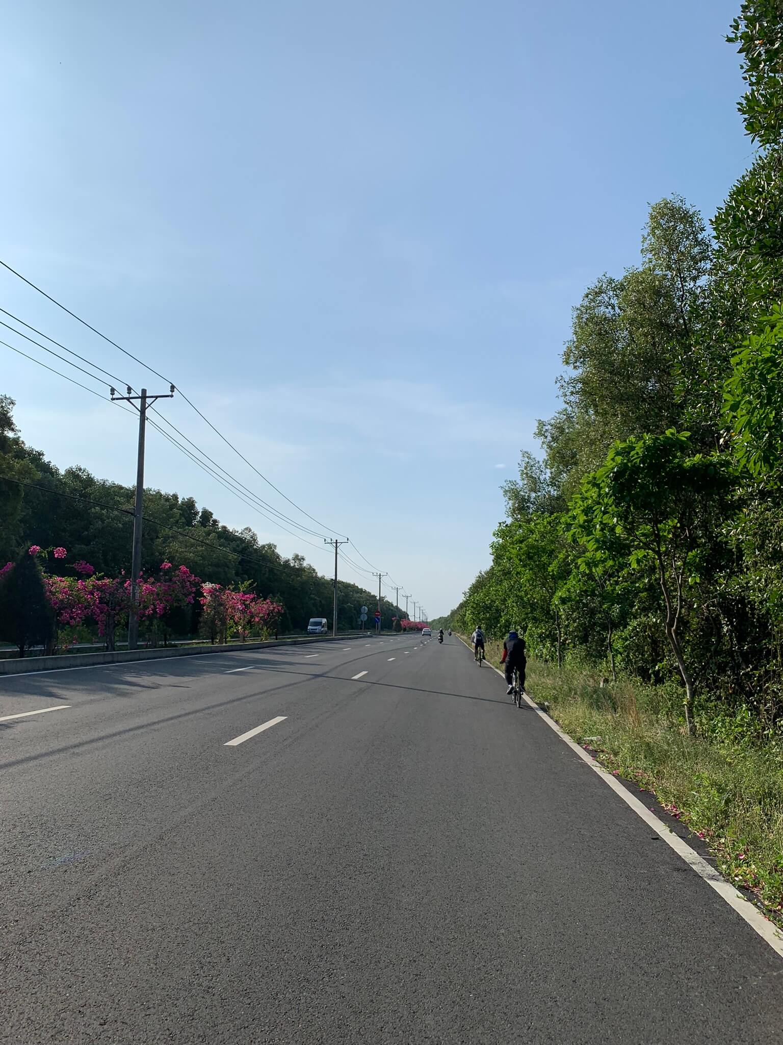 Tới Cần Giờ thì 1 bạn trong nhóm quay về do có việc gấp nên chỉ còn 4 người tiếp tục hành trình. Ngồi uống nước mía cô bán hàng nước nói: “Mấy đứa để xe lên xe bus đi tới đó cho đỡ mệt”, nhưng những lời nói đó sao đủ sức lung lay ý chí quyết tâm chinh phục đang bừng cháy trong 4 con người này đâu (thật sự lúc đầu lên google kiểm tra thì đường này không quá dốc, độ dốc chỉ 5m so với mực nước biển, nên ai cũng nghĩ rằng, ui ba cái đồ yêu này sao làm khó được chúng tôi). Nhưng sự thật là….không tính tới việc gió thổi ngược, sức gió hãm sức chạy, nhiều khi mình xuống dốc mà không có cảm giác đang xuống dốc, còn chạy đường bằng thì nó cứ bị lệt lệt về một bên do gió thổi mạnh quá. Phía trước con đường là Gió, Phía trên con đường là Nắng, càng về trưa thì combo đã trở thành 1 nỗi ám ảnh thật sự với 4 cua rơ.