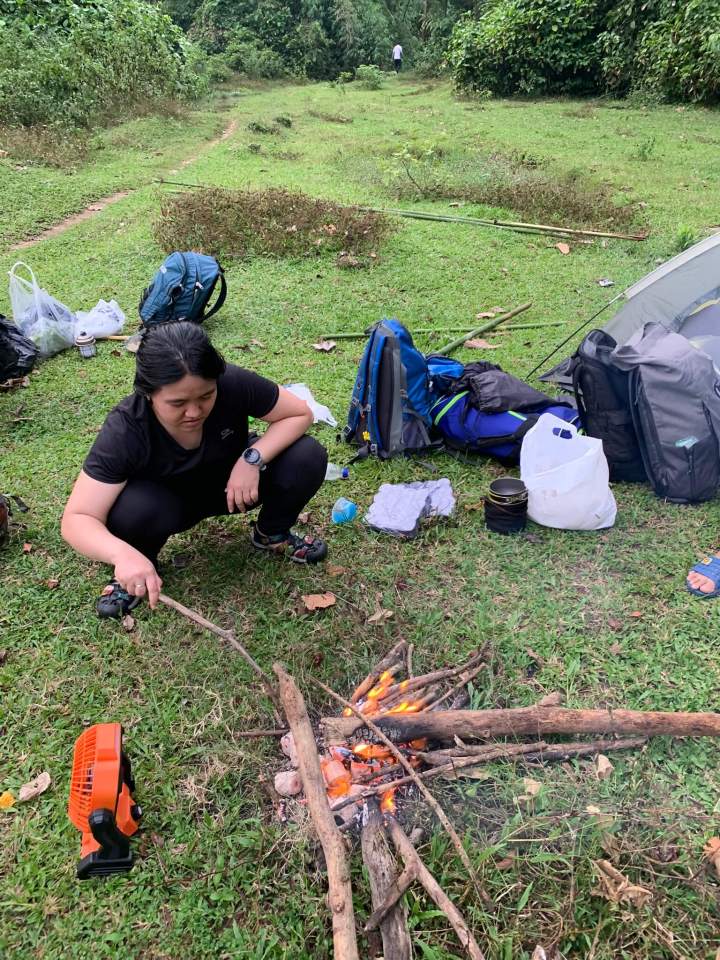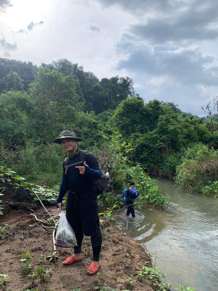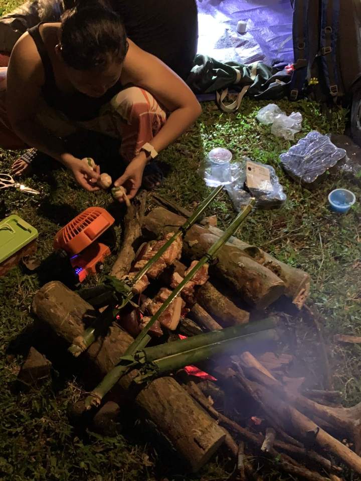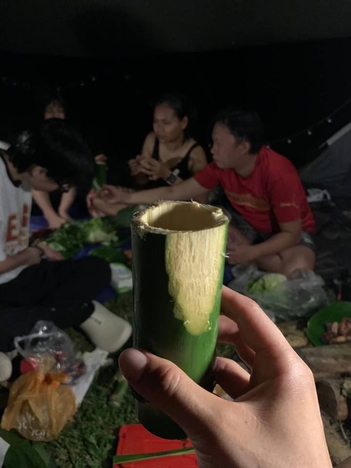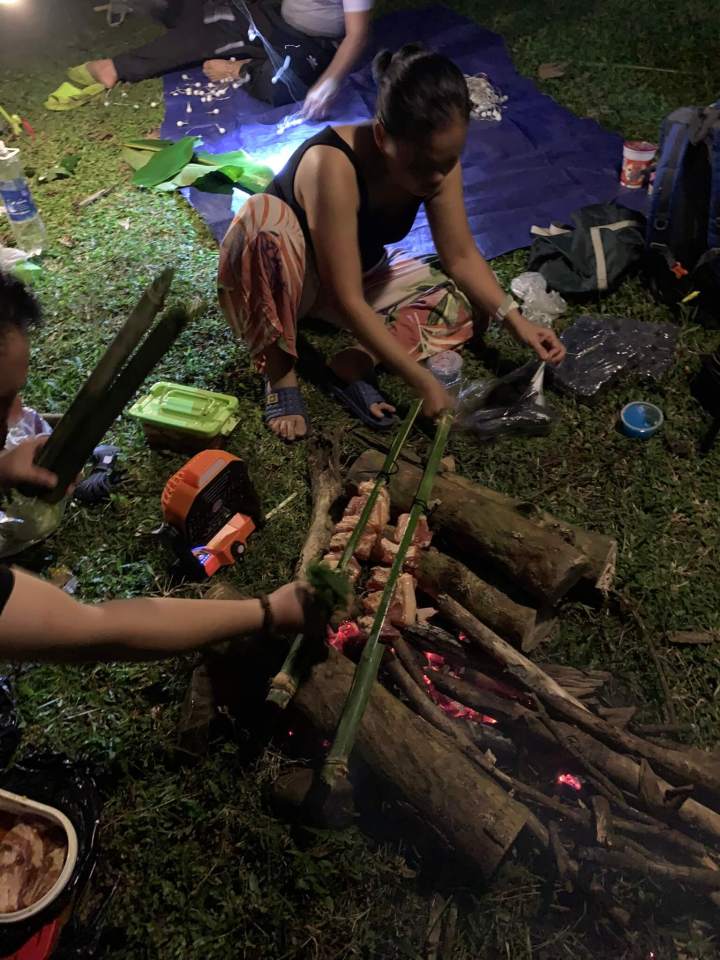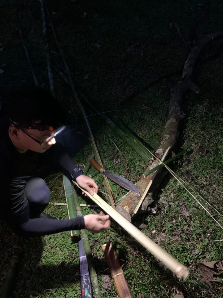 Anh Nhựt mang cả cưa, dao trong balo cứ tưởng ninja, ảnh đi chặt tre về để làm cơm ống lam, món này được mua nhiên liệu gấp gút ở chợ Tà Pao. Với tình hình thiếu thốn hiện tại, ảnh làm luôn xiên thịt tạm, lấy dây thừng buộc lại 2 bên để không bị rớt thịt, ly tre, còn lá dông làm lót đồ ăn sau nướng. Có gì sử dụng được thì tận dụng hết. Nhóm cũng hết nước rồi, ra con suối lấy nước, nấu sôi lên, lọc qua ống tre nhét giấy.