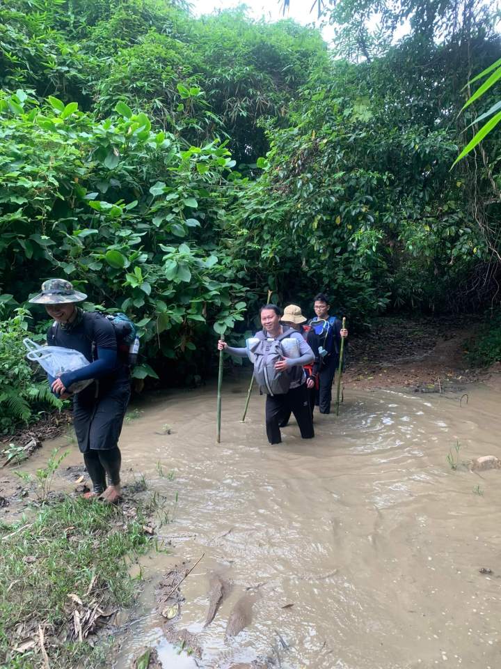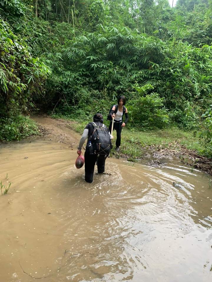 Từ bờ sông nhóm đi qua rẫy cao su, rẫy điều, rồi đường bắt đầu trở nên khá lầy lội. Lúc đầu đi qua suối mình bỏ giày ra để không bị ướt, nhưng với mực độ nhiều như vậy kệ luôn, lội bì bõm rồi qua suối nó tự rửa sạch đi tiếp. Có đoạn chú Tân chỉ bước nhầm một nhịp, cả nửa cái chân biến mất dưới lớp bùn. Đoạn này vắt cũng đã bắt đầu ra mặt, nên máu cũng đã rơi một ít cung cấp cho sự sống của tụi nó.