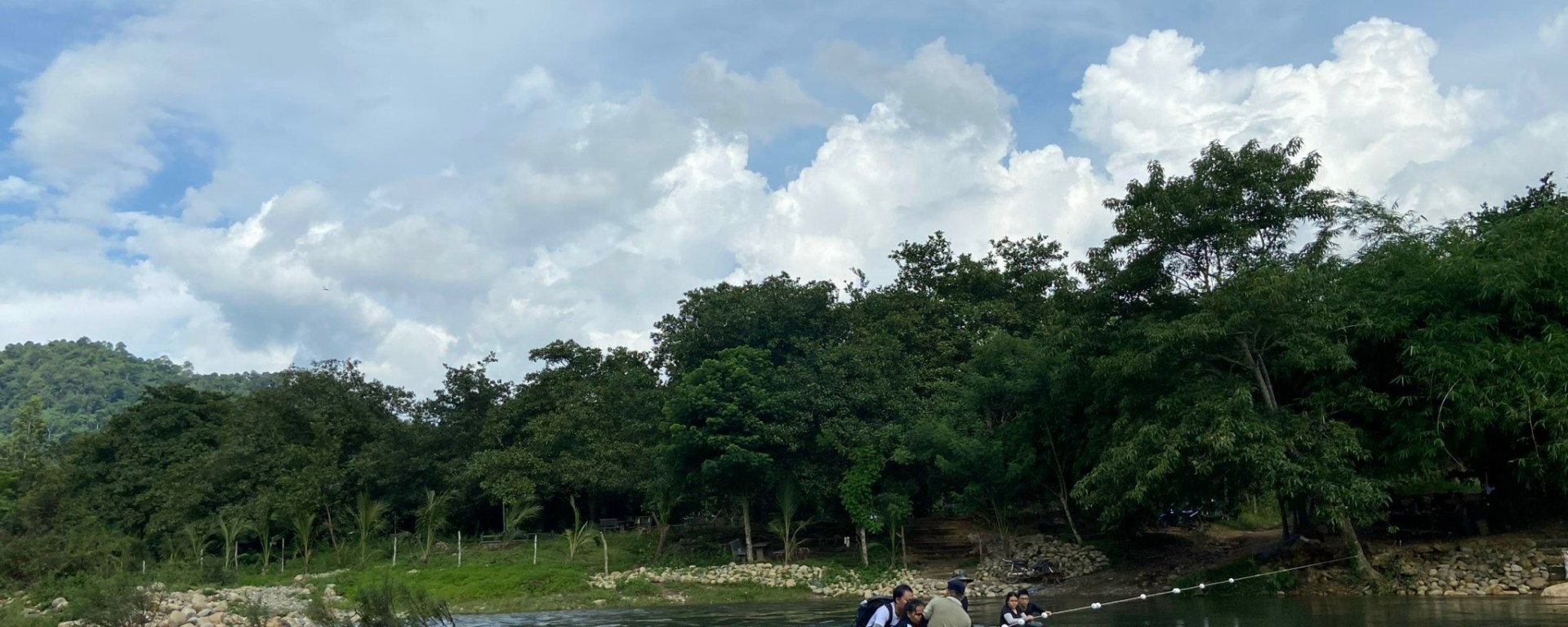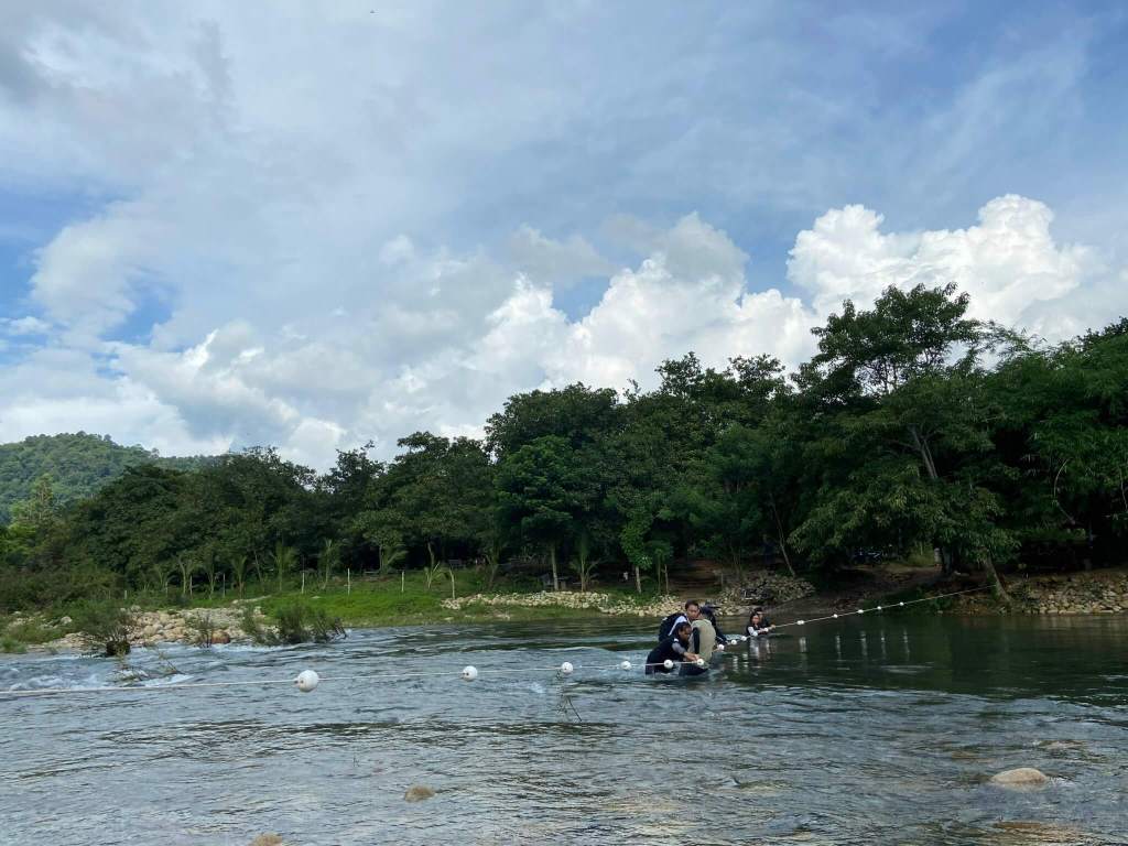 Đồ đạc đã an yên bên bờ bên kia còn người thì chưa ổn lắm, nam thì qua ok còn nữ thì có chút khó khăn, bé Hằng có 2 anh hộ tống lúc qua tới giữa sông thì nó buông luôn 2 chân do vấn đề chiều cao và nước siết, hên chưa bỏ tay ra. Sau một hồi vật vã cuối cùng 8 đứa cũng mất hơn 30 phút chỉ loay hoay ở con suối này. Qua được tới bờ nhưng có mấy bạn bị chuột rút, phải ngồi lại, sau đó mới có thể bắt đầu đi tiếp được.