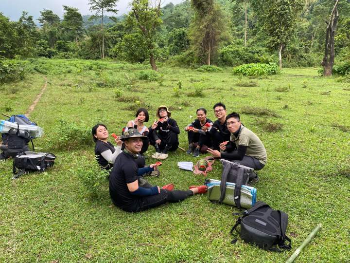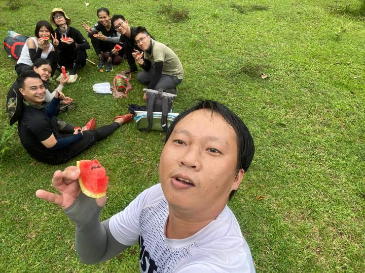 Nhóm dừng nghĩ mệt, ăn dưa hấu, người hạnh phúc nhất lúc này có lẽ là Trân, nó vác trái dưa hấu 3kg mấy, có mấy khúc nó quạu muốn quăng trái dưa hấu đi theo dòng suối luôn. Hên ăn ngon ngọt ứa trong miệng, thanh mát chứ không thì nó quay lại chợ Tà Pao tìm cô bán dưa hấu máng vốn rồi.