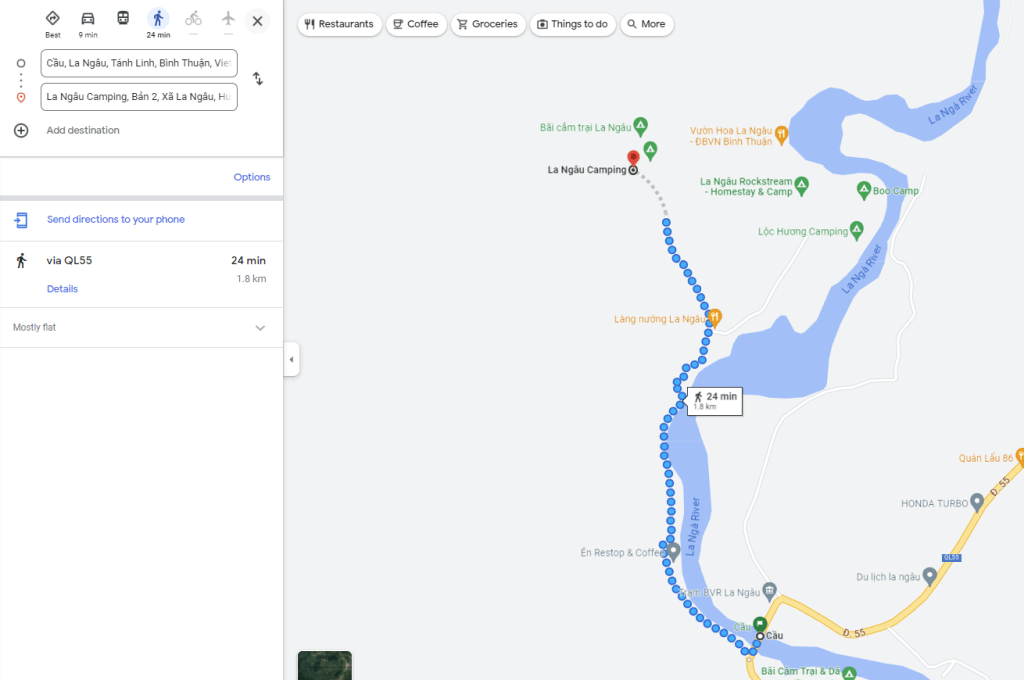 Mình thấy khu La Ngâu Camping vừa xây dựng vừa hoạt động luôn, có cung cấp chỗ lưu trú bungalow, phục vụ khách theo nhóm, ăn uống đổi không khí bên bờ suối La Ngâu. Mình gặp bạn nữ đang bán nước nói mong muốn nhờ chở đồ đạc qua sông, bạn nữ quay qua bạn nam nói ngôn ngữ gì đó mình không hiểu mình đoán đây là khu vực của anh em đồng bào Draklay, vẫn duy trì chế độ mẫu hệ cần có sự đồng ý của vợ thì chồng sẽ làm thôi. Cảm tạ trời đất cuối cùng đồ đạc cũng qua được bờ bên kia.