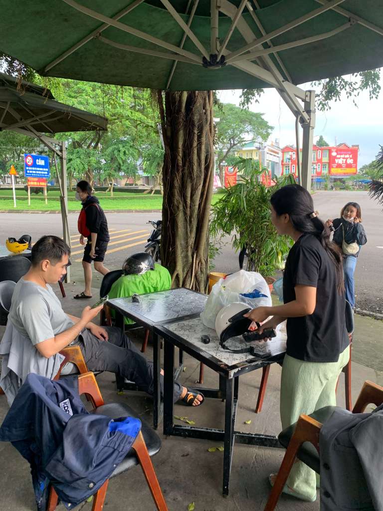 Đi chơi nhưng không quên tiệc trà chiều nhưng thay vì trà và bánh mặn nhẹ thì uống cà phê và bánh trung thu. Vừa ăn xong lên đồ dắt xe ra thì tèng téng teng 1 xe bị bể bánh. Mình vội chạy xung quanh hỏi thử thì mọi người chỉ chạy ngược về phía Dầu Giây mới có, trong khi mình chạy đi thì mọi người đã tra google tìm thấy tiệm sửa xe rồi. Biết tí công nghệ nó khác liền.