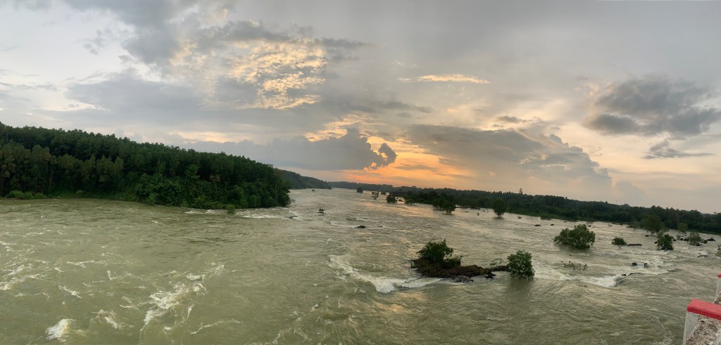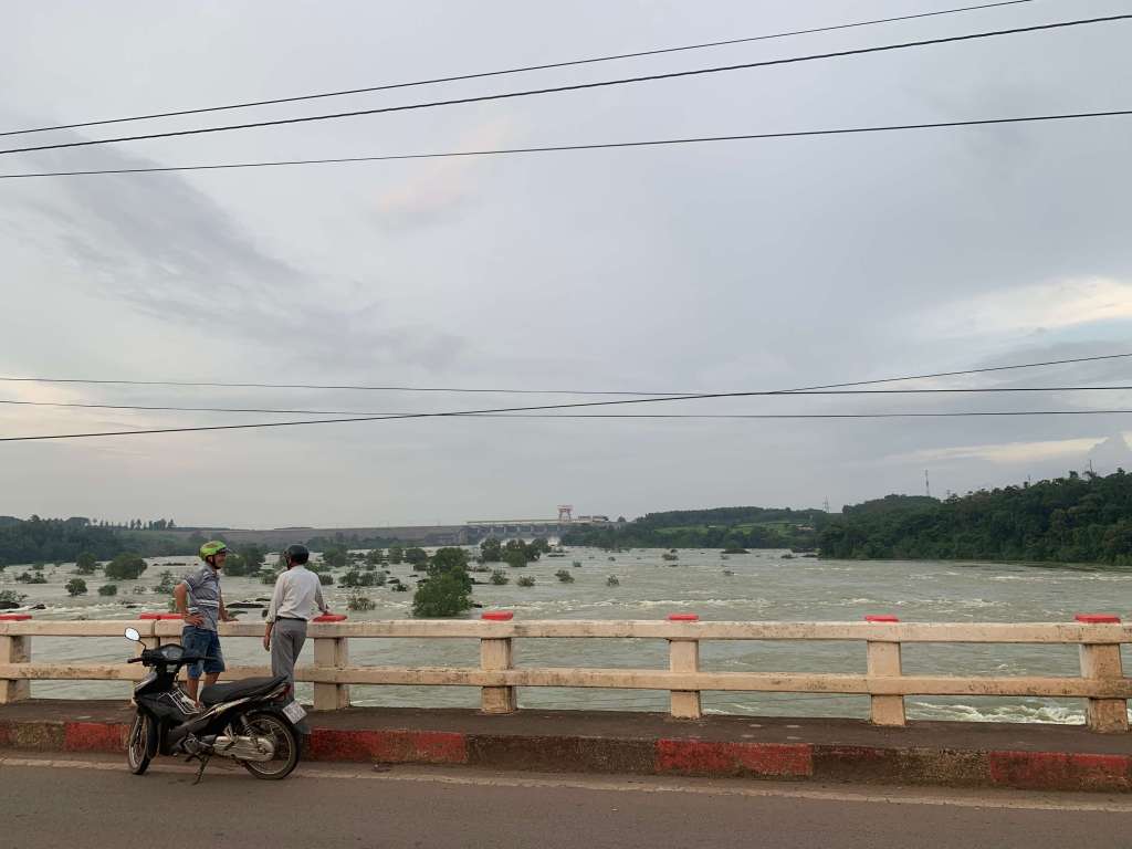 Lần trước mình cũng đi ngang cầu Đồng Nai, nhìn xuống lòng sông trơ đất đá, chỉ còn lại vài vũng nước nhỏ, người ta xuống đó dựng dù ngồi câu cá; còn hiện tại mình đang đứng trên cầu nhìn dòng nước cuồn cuộn chảy, cả 6 cửa đập giữ nước đều mở là có thể hiểu được nước thượng nguồn về nhiều cỡ nào, hồ không thể chứa được nữa phải xả nếu không sẽ có nguy cơ vỡ đập. Cảnh tượng rất hoành tráng ai cũng dừng lại để chụp hình với hồ nước trong khi ánh mặt trời đang dần tắt cuối chân trời.