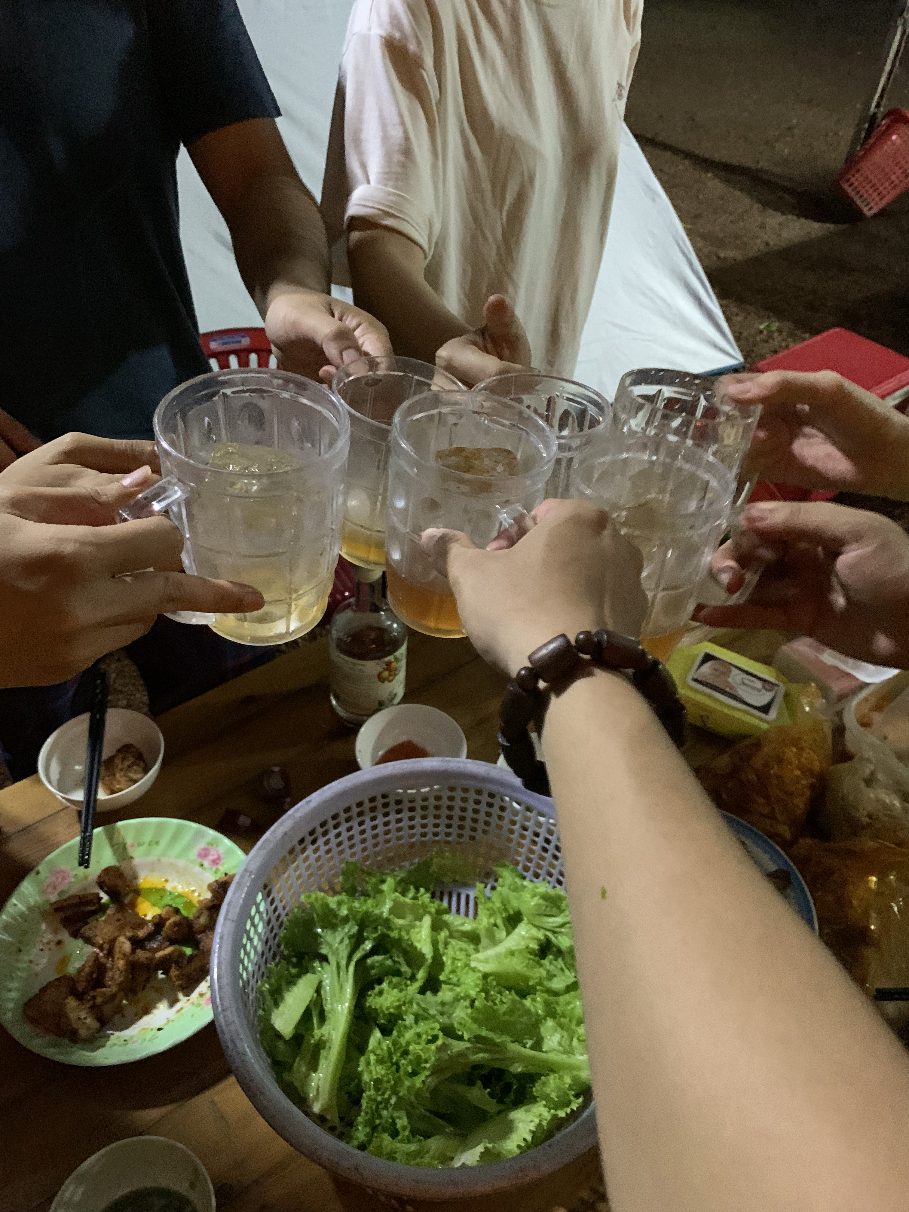 Tối đó mưa vẫn rơi nhưng chúng mình có thịt nướng, 3 chai rượu, cùng nồi lẩu thì chỉ việc ăn uống và nhìn mưa rơi thôi.