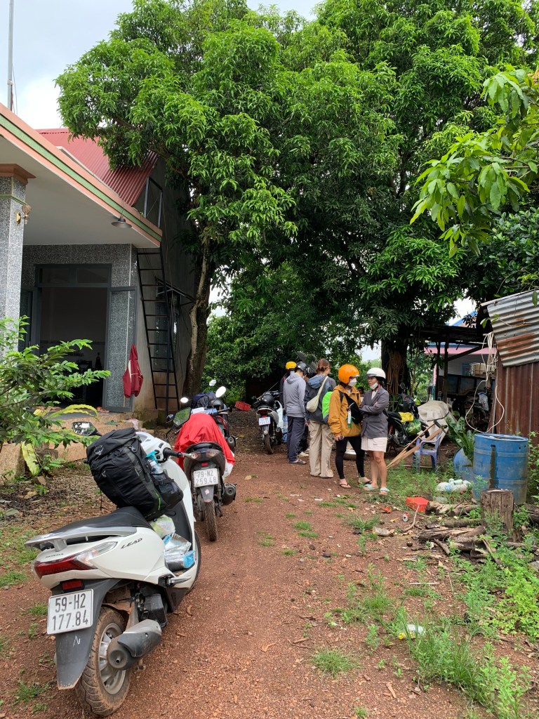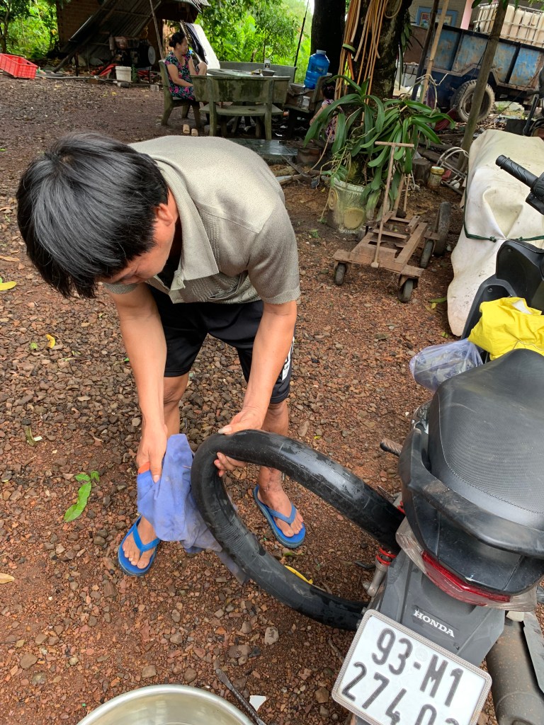 Mình thấy 3 cô chú đang ngồi nói chuyện bên hiên nhà, kế bên cái mấy bơm, tấp vào hỏi có vá xe không, chú không nói gì nhưng cũng không thể hiện sự từ chối. Dắt xe vào chú lấy cái vỏ ra tìm hoài không thấy chỗ bị xì nên kêu đám mình ra sau lấy cái thau nước mưa lên ấn vào coi sao. Cuối cùng cũng tìm ra, bôi keo lên chờ khô, rồi lấy miếng dán bịt kín chỗ xì, làm vài động tác đập để cho miếng dán bám chặt vào ruột xe, cuối cùng đưa cái bình hơi cầm tay cho mình để bơm căng bánh lên. Cả nhóm thở phào nhẹ nhõm cuối cùng cũng có thể đi về rồi.