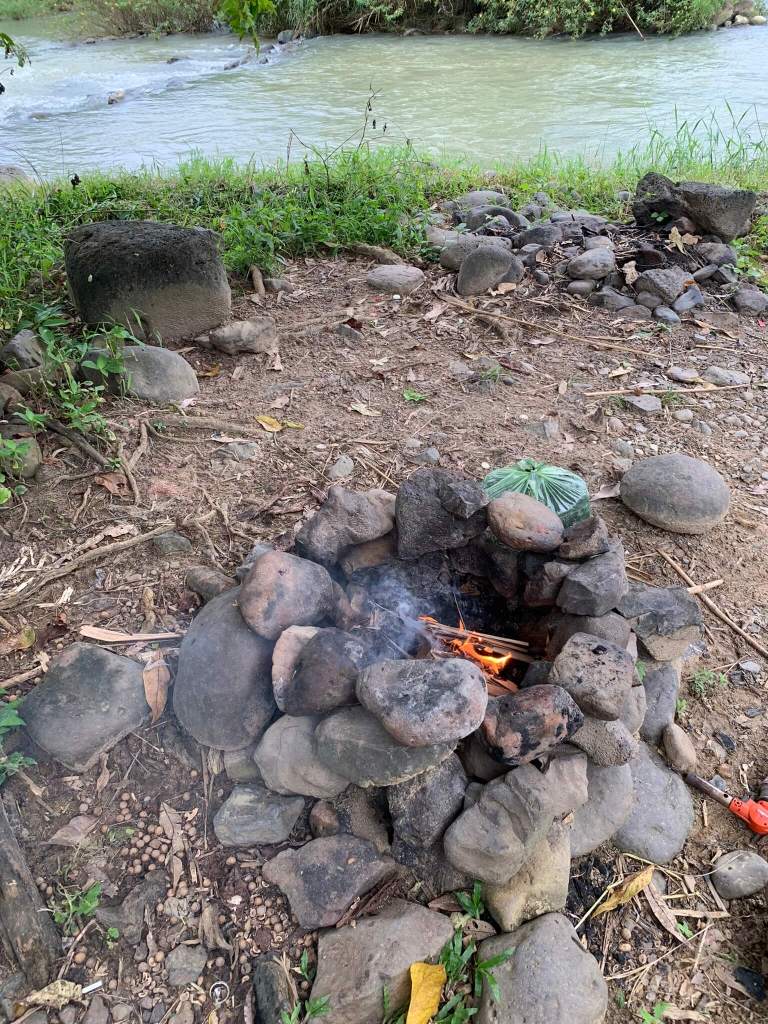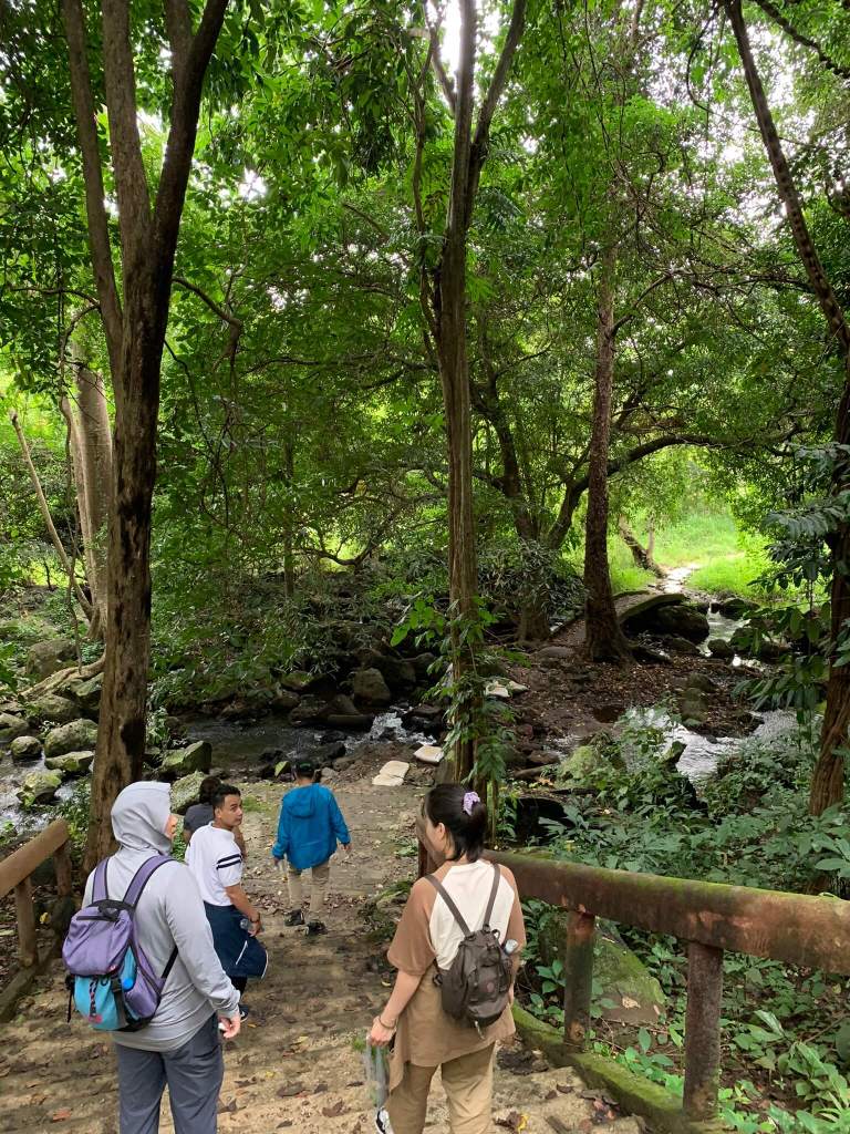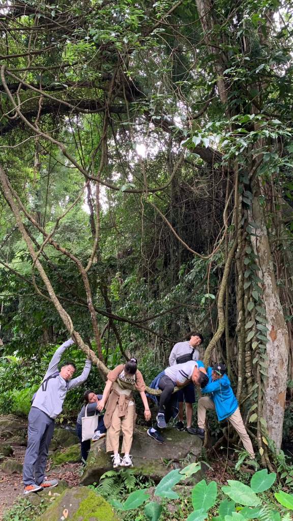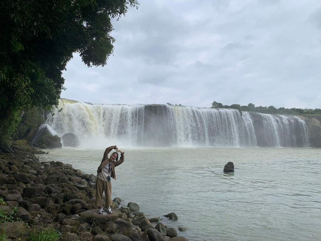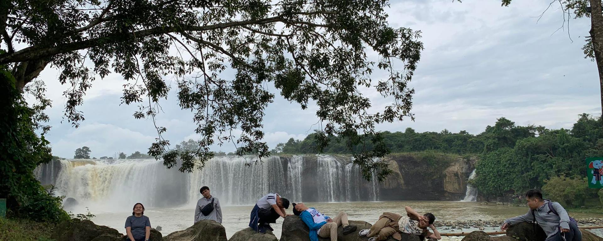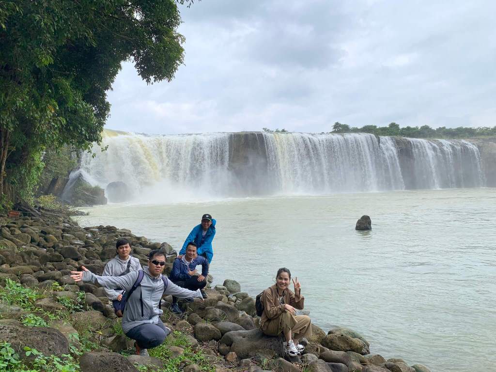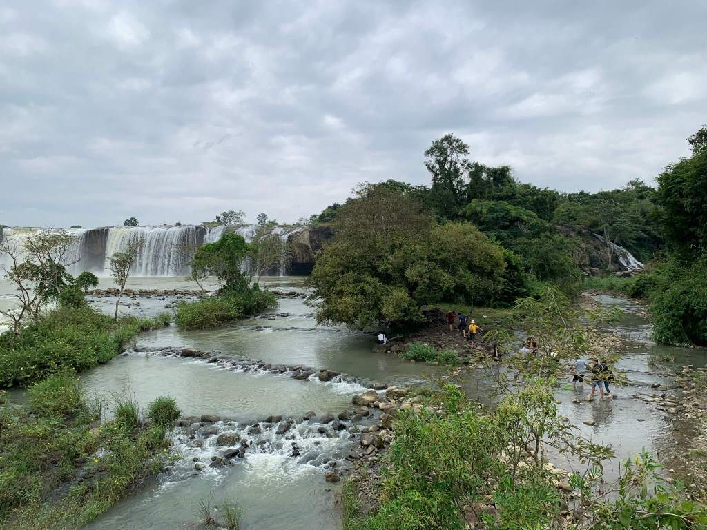 Cuối tuần nên lượng khách tham quan khá đông, cả nhóm cố gắng chen lấn chụp hình nhanh nhất có thể, rồi di chuyển liền qua cầu treo bắc ngang đi qua hòn đảo giữa sông. Men ra ngoài bờ thác thả chân xuống dòng nước và xem mọi người tụ tập nấu nướng ăn trưa. Đâu chỉ ăn mà tiếng loa “kẹo kéo” được cơ hội vang vọng núi rừng, nhưng chu choa hát hay giọng khoẻ nên “chấp nhận”. Tụi mình rời đi để tiến sâu vào rừng nhưng tiếng hát “dù là cơn mưa băng giá …” vẫn vọng theo như níu kéo người nghe.