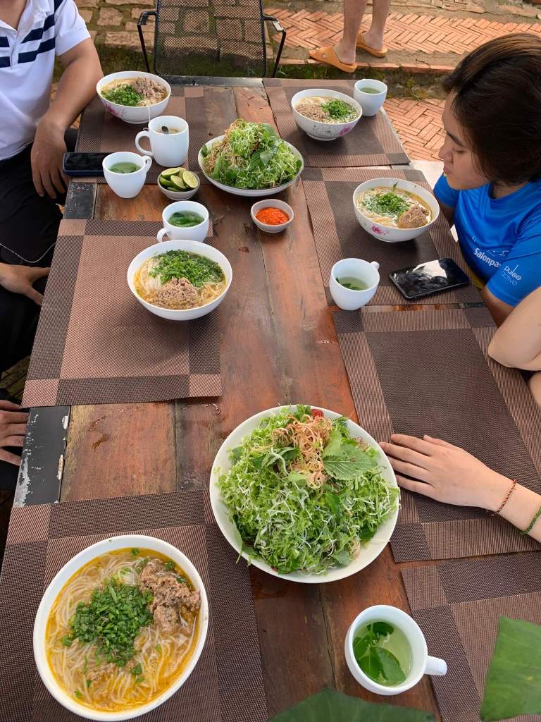 Nay tụi mình ăn bún riêu Ê Đê cho bữa sáng nhưng cô chủ nói rằng cô biến tấu một chút để hợp khẩu vị của tụi mình hơn. Nhìn tô bún hơi trống trãi do chỉ có bún và 1 cục riêu duy nhất. Mình húp thử nước, ăn miếng bún, cắn miếng riêu…wow ngon, nước dùng thanh nhẹ vừa đủ, còn riêu như tan trong miệng. Cái thích nhất mỗi lần lên khu vực Tây Nguyên đó là dĩa rau bào; tươi và ngon kì lạ, nó có một ma lực rất lớn với mình. Một điểm thú vị ở farmstay này là rau cô chủ đều tự trồng, thu hoạch và chế biến các bữa ăn cho tụi mìn. Cô chia sẻ nhiều khi cô chỉ ra cần ra vườn lấy 1 lá môn vào xào là có bữa ăn cho 2 vợ chồng.