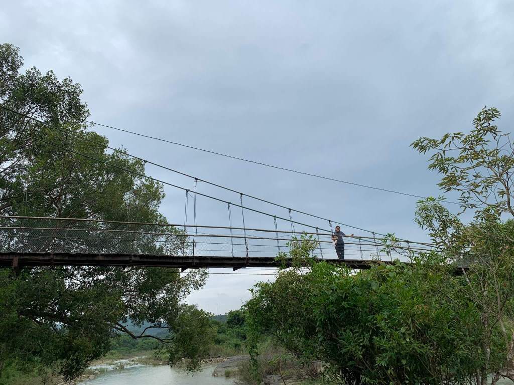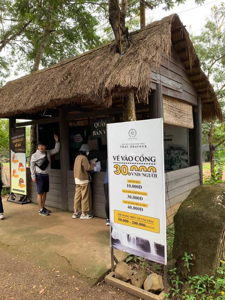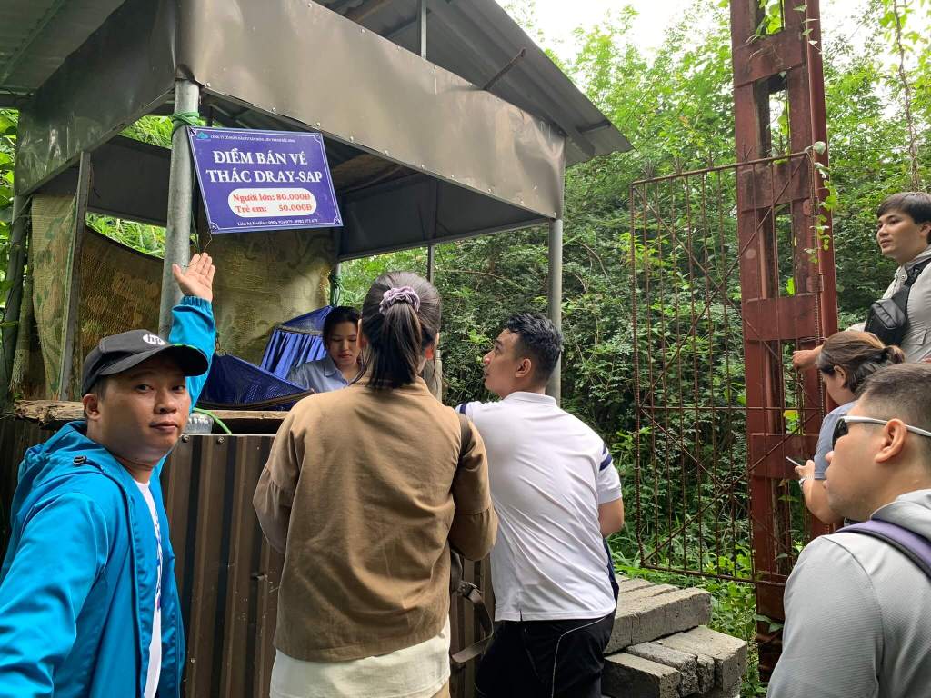 Tụi mình hiện tại đã đứng ở giữa hòn đảo, phía trước có thêm 1 cây cầu treo nữa, tưởng được đi qua ai dè bị vịn lại, à… đó là chốt bán vé. Vé tham quan Draynur chỉ tới đây thôi, nếu muốn qua thác Dray Sáp thì phải mua vé lần nữa 50k; thác này thuộc quản lí của Đắk Nông nha không còn tỉnh Đắk Lắk nữa rồi, tụi mình đang đi giữa biên giới 2 tỉnh, ghê thật.