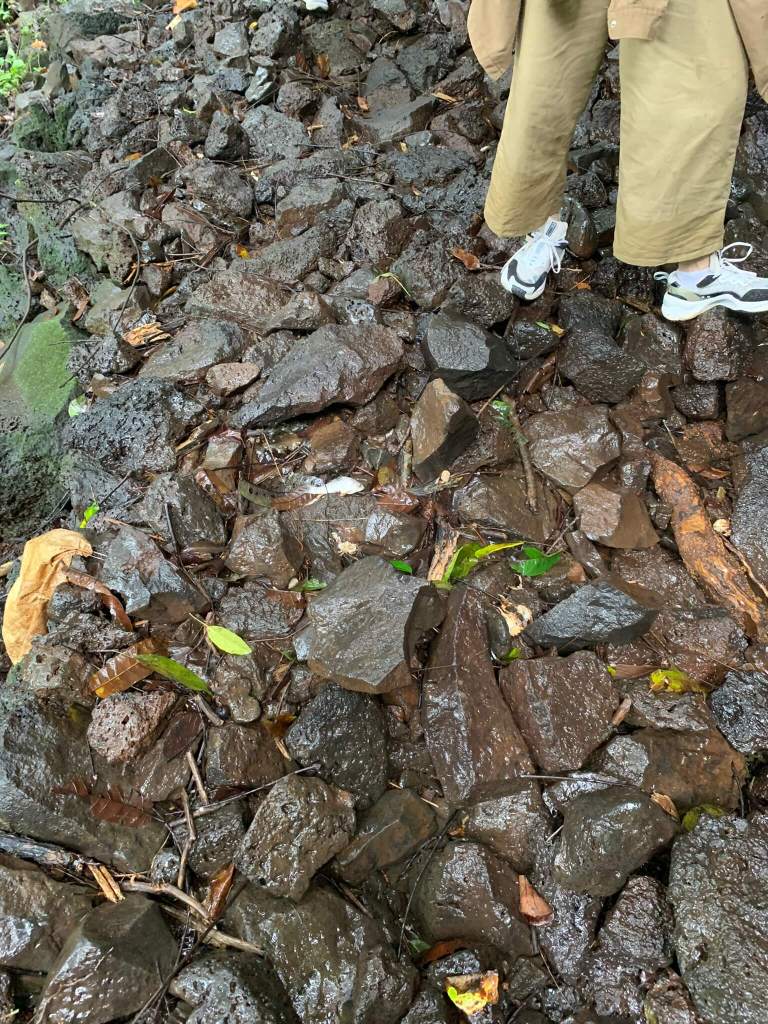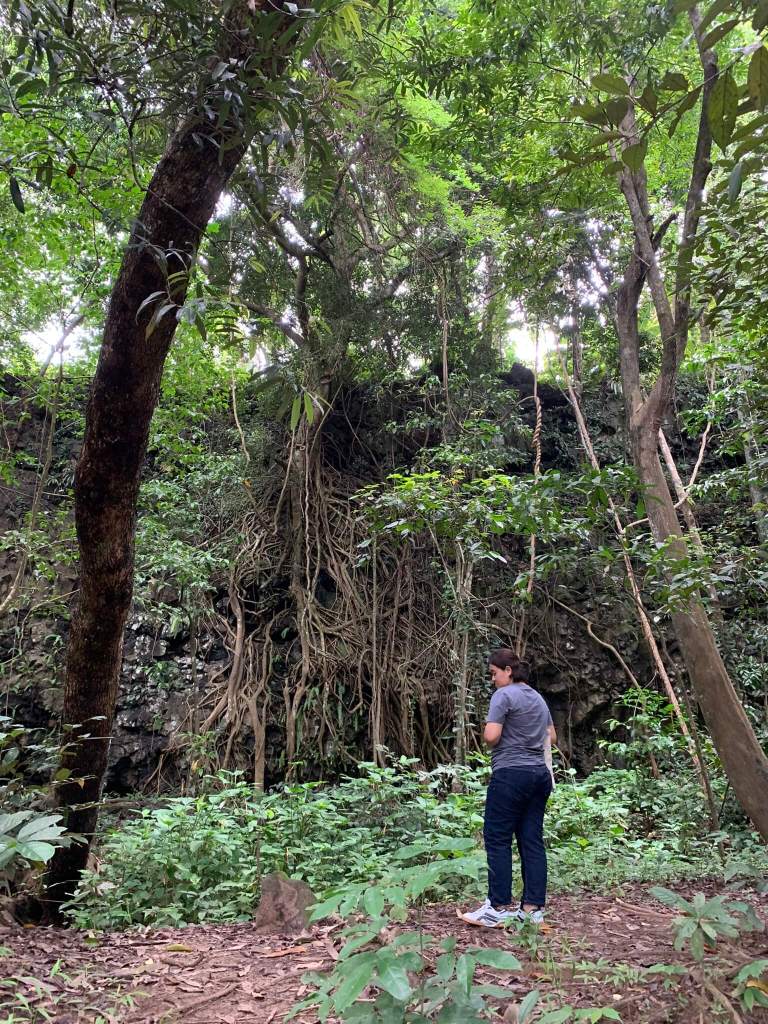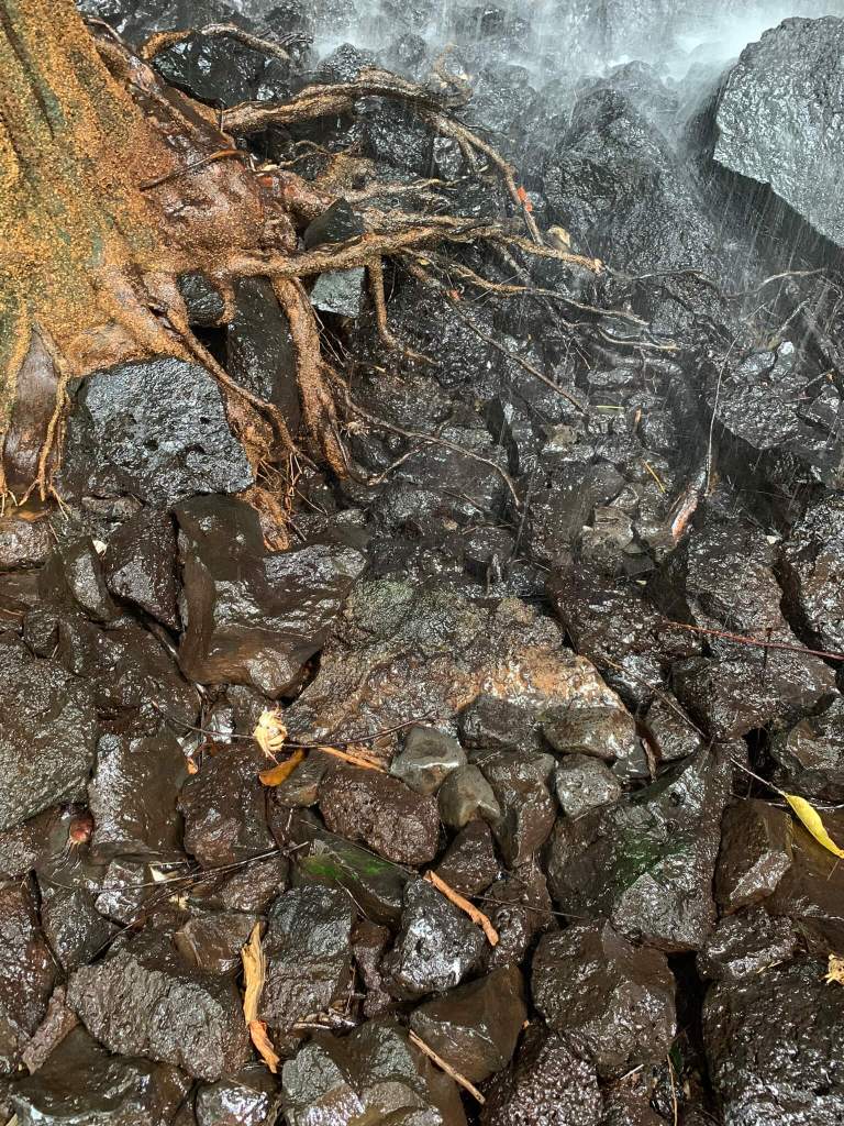 Thôi lỡ rồi mua vé đi tiếp thôi, vừa qua cầu một gốc cây khổng lồ ôm lấy vách đá dựng đứng kèm the dòng nước rơi xuống tạo mấy dòng suối nhỏ khá đẹp. Càng tới gần vách đá, mùi tanh bốc lên càng mạnh hơn, mùi này mình thường ngửi khi qua chợ cá. Đúng thật, xác cá xác cua nằm lăn lóc trên đá ngay dưới điểm rơi cuối của máy dòng suối nhỏ, chắc tụi nó chỉ “đi nhầm đường, rơi nhầm chỗ” mà thôi, siêu thoát nha mấy đứa.