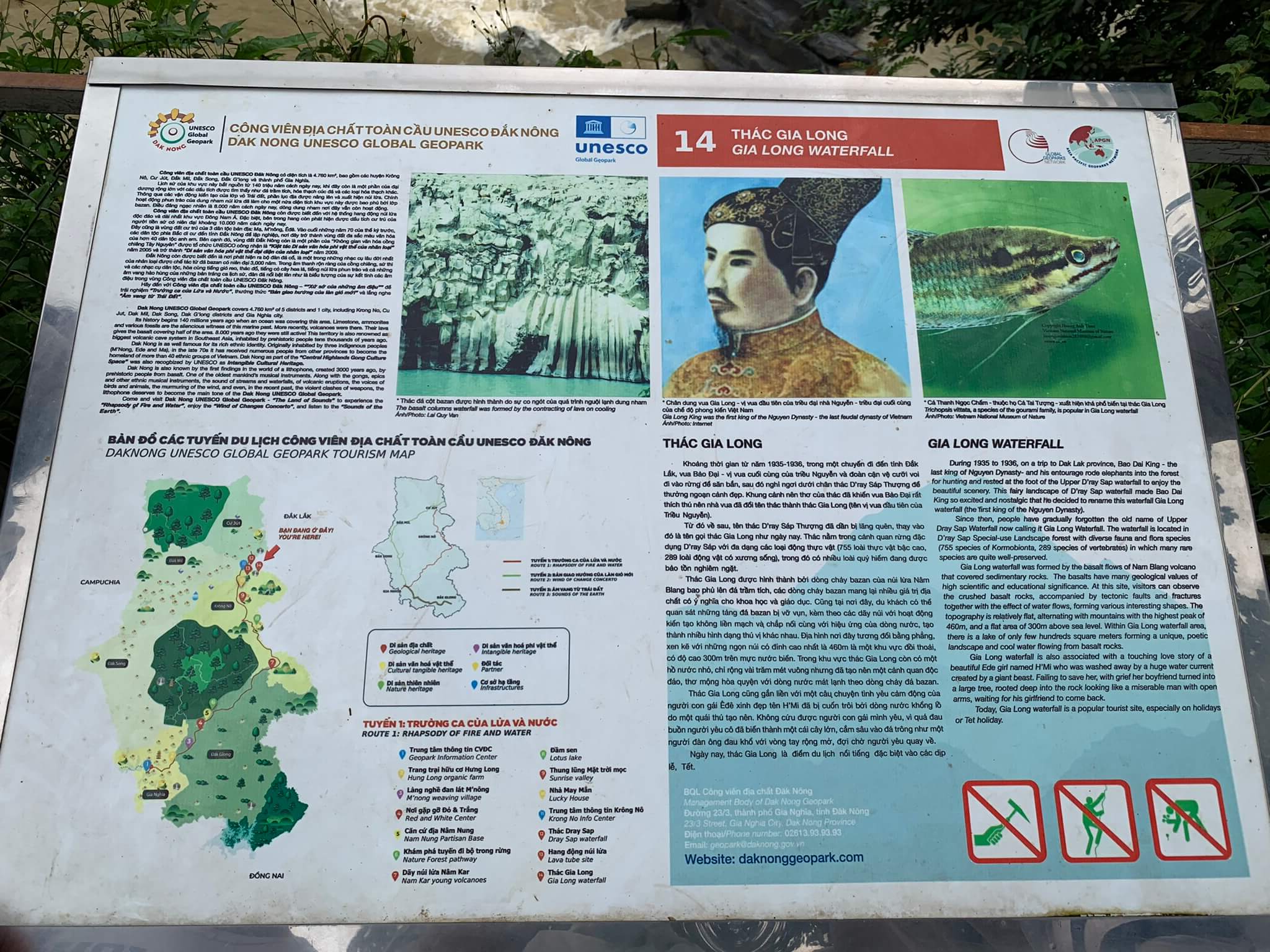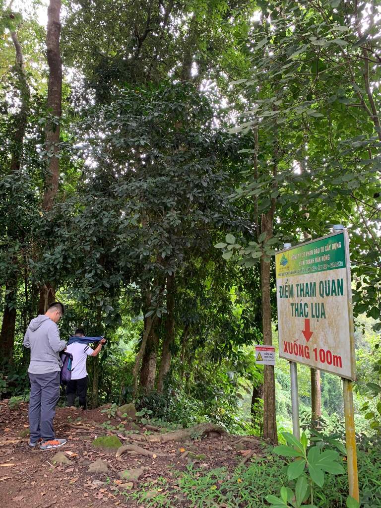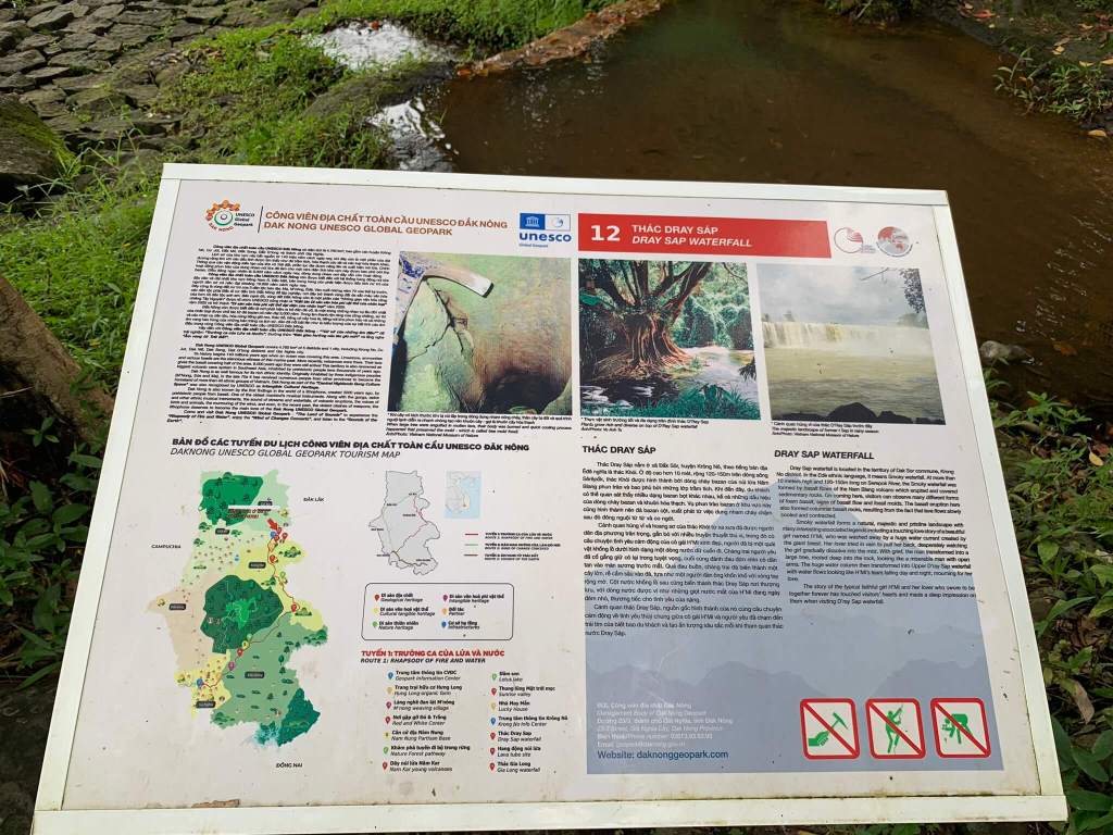Thác Gia Long khá xa nó nằm cách chỗ tụi mình khoảng 5km nên phải có xe chở vào chứ đi bộ không biết tới khi nào mới tới. Thật ra khu vực này tên chính xác của nó là : công viên địa chất toàn cầu Unesco Đắk Nông bao gồm quần thể núi lửa Chư Bluk, cánh đồng nham thạch núi lửa…nhìn bản đồ khu vực cụm 3 thác tụi mình là 3 chấm nhỏ cuối cùng trên bản đồ trong gần hơn chục điểm tham quan.