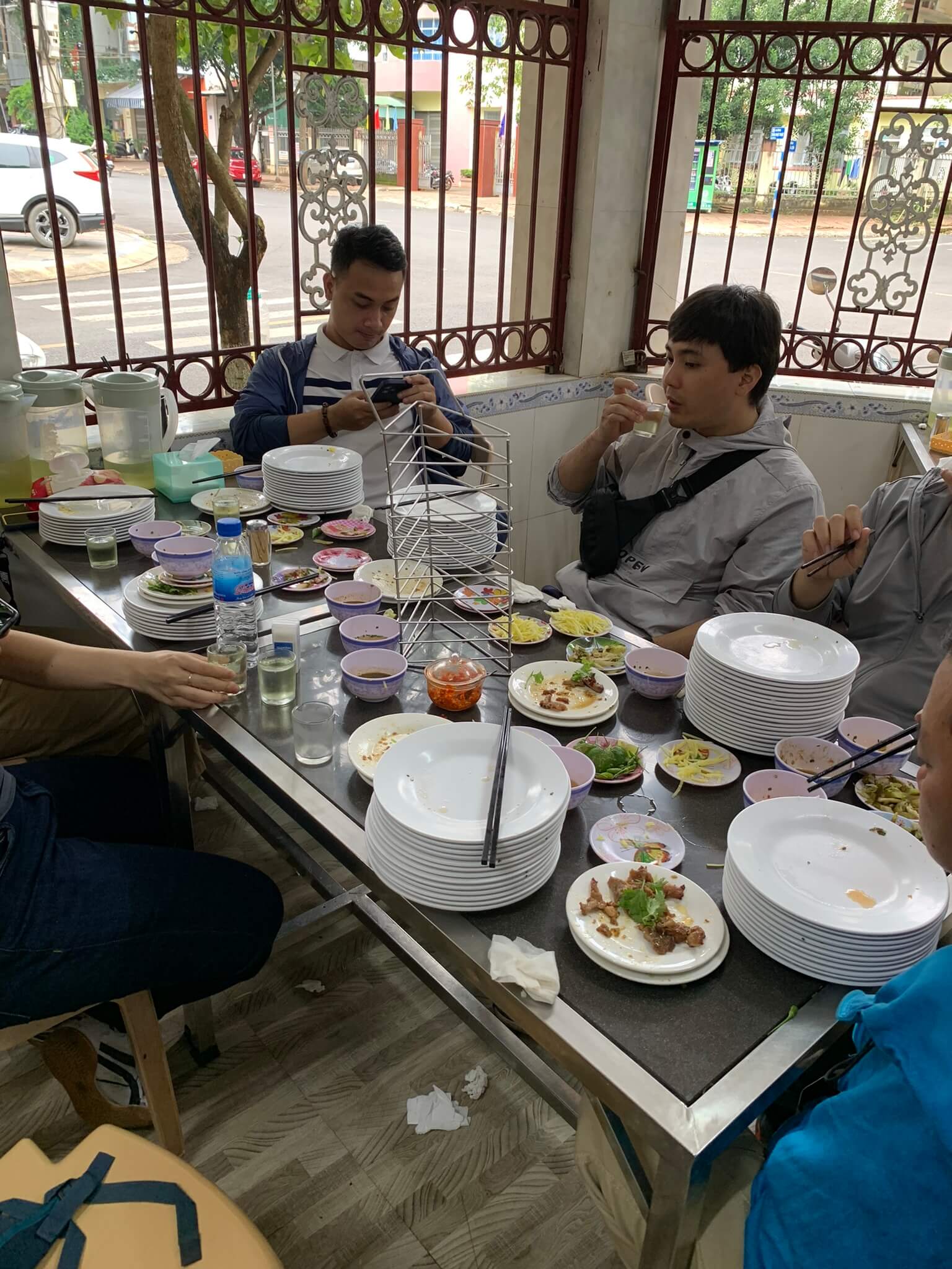 Nhóm ăn trưa bằng món bánh ướt Buôn Mê, chỉ với 1 topping duy nhất là thịt nướng kèm theo dĩa đồ chua và xoài. Thôi mỗi đứa ăn cỡ chục dĩa cho đỡ đói, sau đó mua trà sữa mang uống cho thơm miệng, dư thời gian diễn tiểu phẩm giúp đỡ người nghèo khó trước của quán trà sữa.