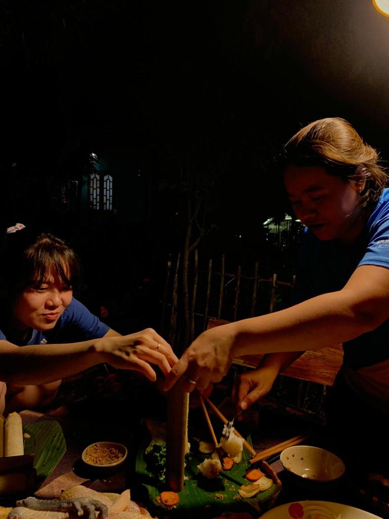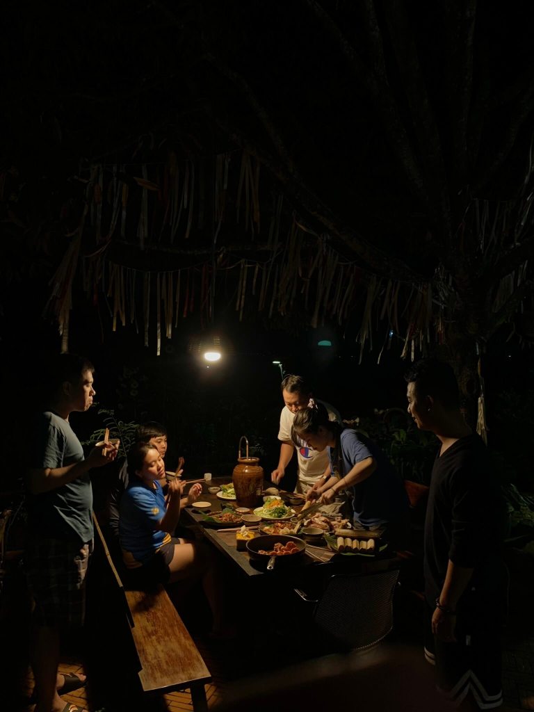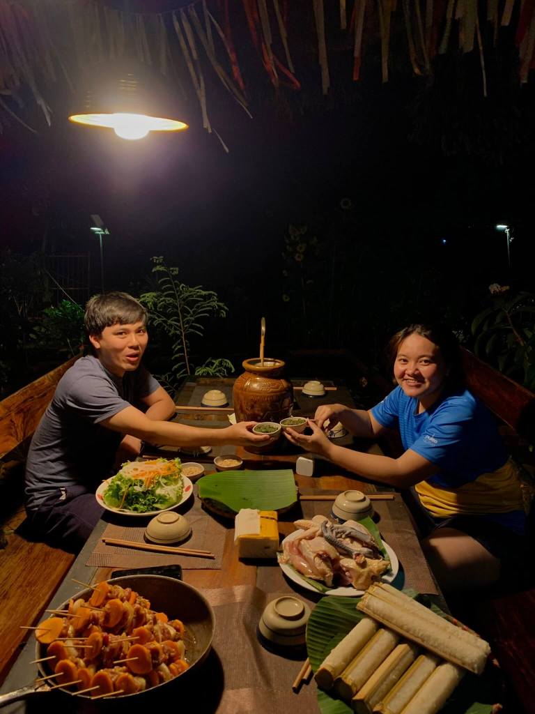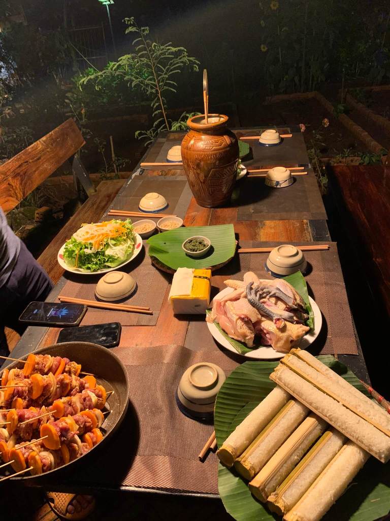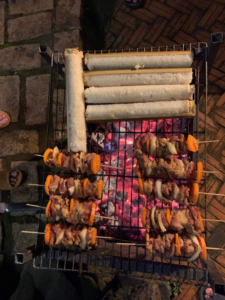 Đêm đó tụi mình làm tiệc BBQ hơi bị lớn, cơm lam, thịt nướng, gà nướng và khai trương bình rượu cần mua hôm trước.