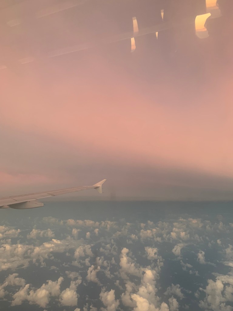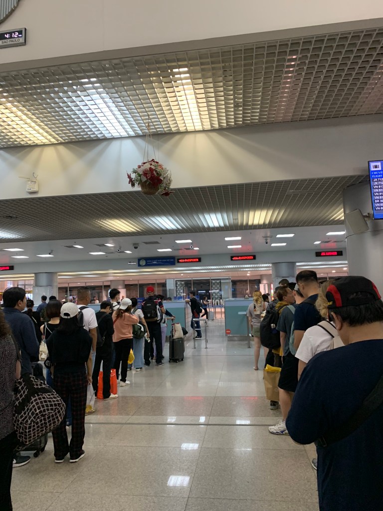 Mình đi nhanh qua khu vực sân bay quốc tế, do không mang hành lí nên chị chung team của nói cứ đi thẳng vào sân bay để qua cổng xuất ngoại. Mình lấn cấn lắm vì đa số mình phải đi lấy vé xuất tại chỗ gửi hành lý sau đó mới đi qua cổng này, thôi tin chị thử. Và… sau gần 30 phút đứng xếp hàng, mình phải quay lại lấy vé chứ không đưa vé online điện thoại được. Sau 1 tiếng, mình mới qua được cửa và tiến vào chỗ đợi lên máy bay.