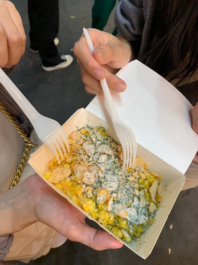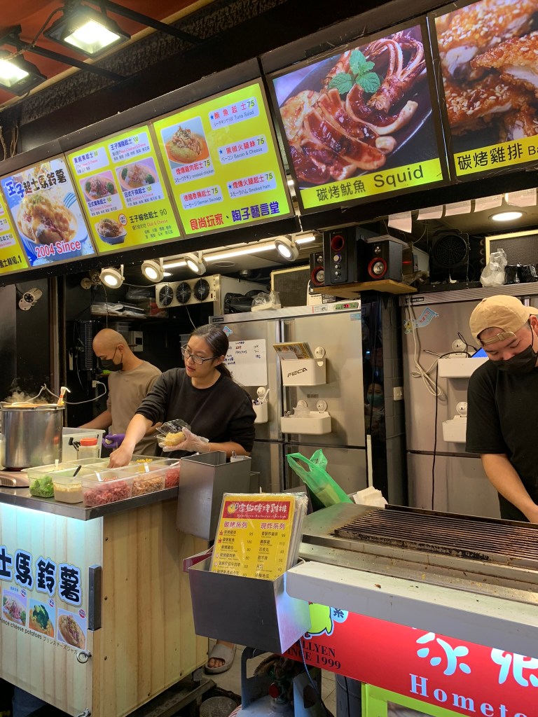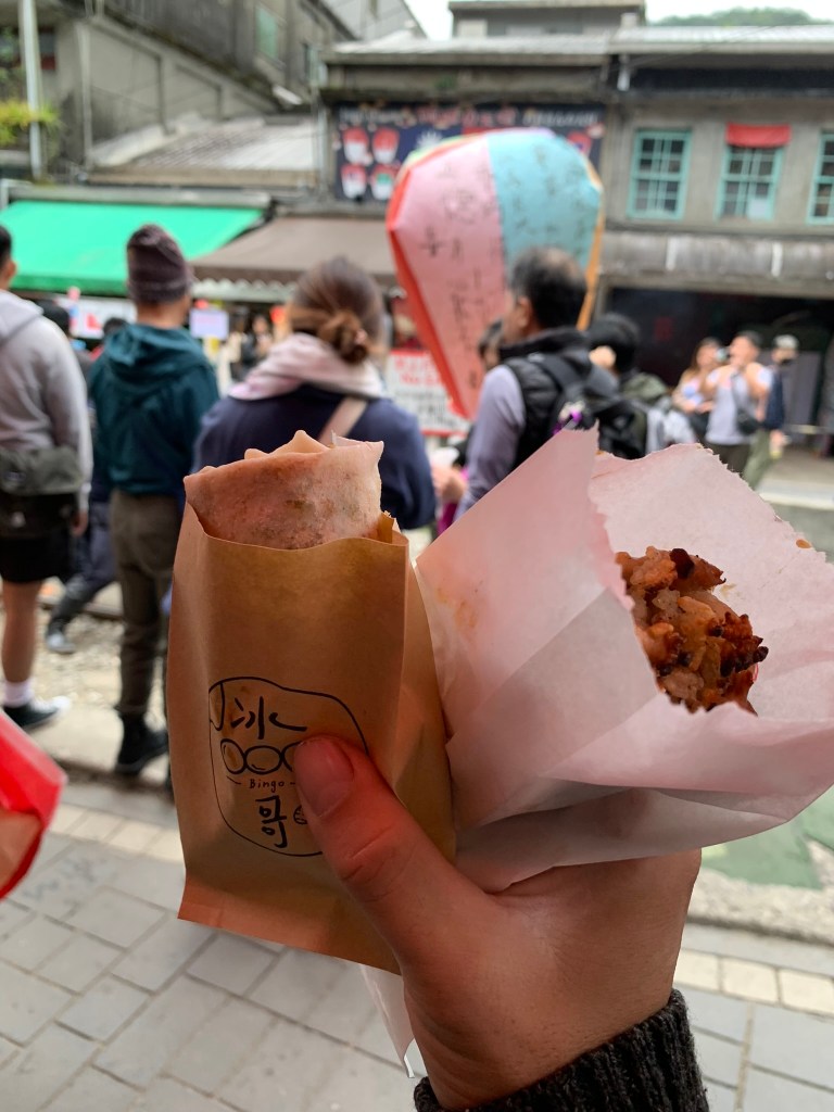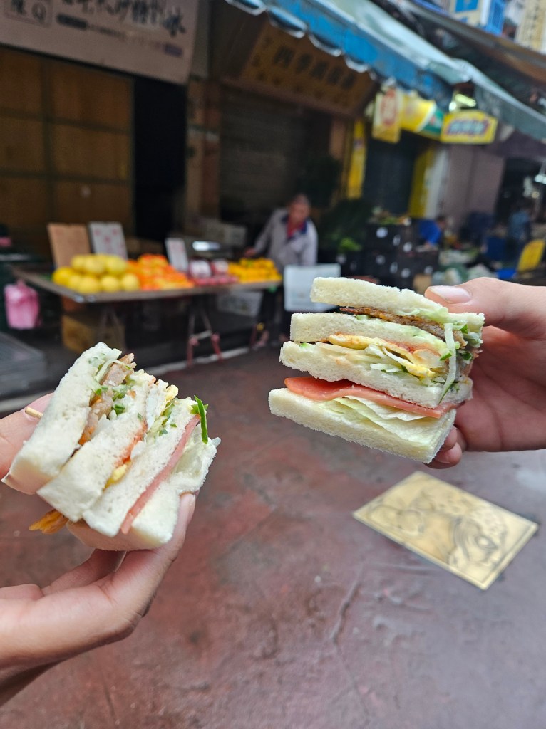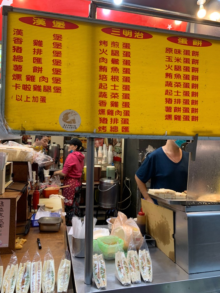 Nhóm cũng ra khỏi nhà lúc 6h50, thời tiết hôm nay lạ lắm: ra ngoài thì cần có dù để che, còn mặt trời thì đi chơi đâu rồi, né đảo Đài Loan cả ngày. Đi khoảng 50m thì có quán bán đồ ăn sáng, nhìn rất hấp dẫn, tấp vào thì toàn nói tiếng Trung, lấy điện thoại mở google translate chế độ hình ảnh, nói thật là không biết gọi món như thế nào. Đang lúng túng thì chị gái đứng bán kế bên hỏi: “Ủa người việt hả?” : “đúng rồi chị”. Xong chỉ quay qua anh kia nói, tụi nó đồng hương tao nè, để tao bán cho. Chỉ bắt đầu nói là món signature ở đây là món sandwich, hamburger và trứng chiên; chỉ nói các món này sẽ khác so với ăn bên Việt Nam lắm.