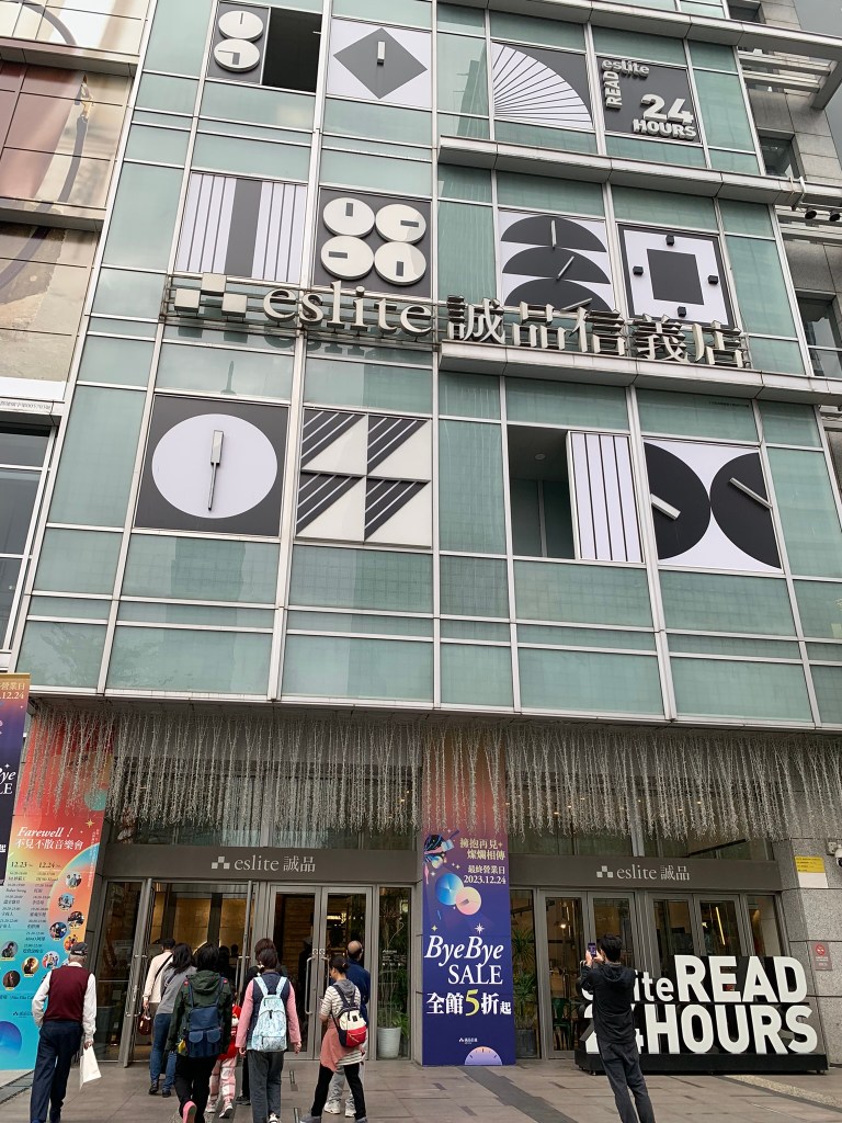 Đây là một chuỗi hiệu sách rất nổi tiếng tại Đài Loan, các cửa hàng mở 247. Lúc vào thì mình mới biết có ngoài sách thì bên đây nó là siêu thị, bán từ thực phẩm, tới nội thất, đồ gia dụng, có luôn sản phẩm công nghệ. Nhà sách này theo cảm nhận của mình thì không lớn bằng nhà sách Kinokuniya ở Singapore, với lại sách chủ yếu bằng tiếng Trung có lẽ phục vụ cho người dân ở đây là chính, sách tiếng anh chỉ có vài khu với đầu sách khá ít ỏi. Cửa hàng Eslite tụi mình đang đi sẽ đóng cửa vĩnh viễn sau nhiều năm mở cửa do không thoả thuận được hợp đồng vào cuối năm nay tất cả các sản phẩm off 17%. Thời điểm mình đang viết những dòng này thì nó đã đóng cửa luôn rồi.