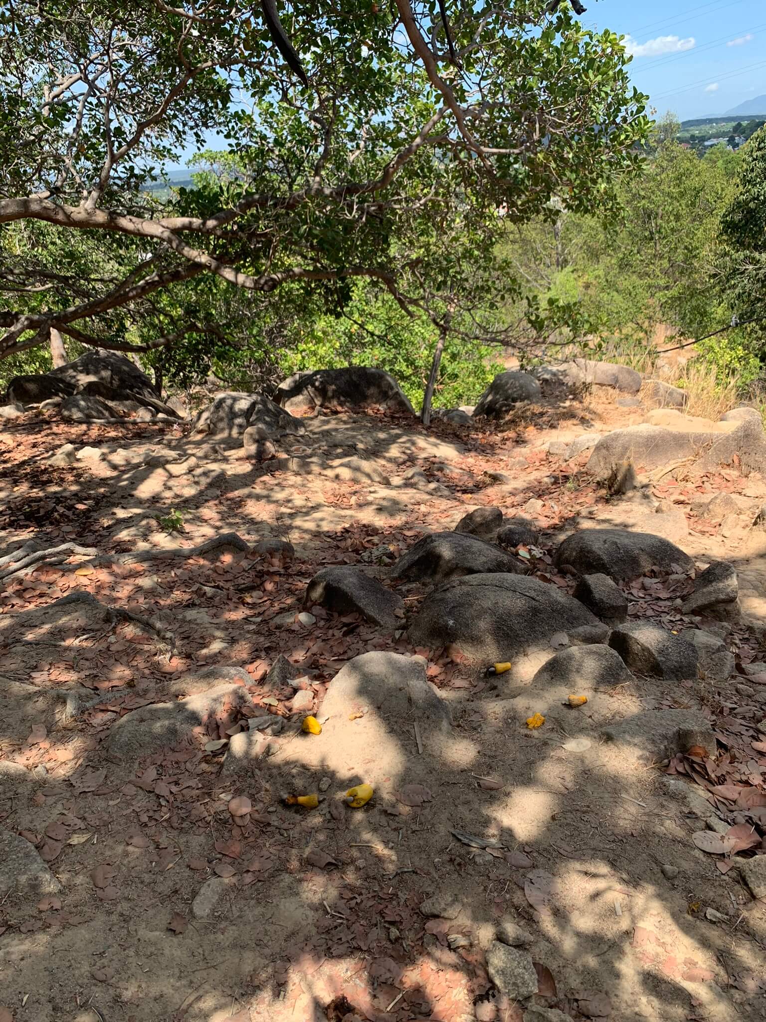 Đi đúng mùa đám cây Dầu rơi, tụi nó mọc thẳng đứng lại rất cao giữa đám rừng lá thấp nên rất dễ nhận biết; một cơn gió thổi qua, cuốn tụi nó rơi xuống như chong chóng xoay khắp cả trời. Trái dầu này lạ lắm, nó không cân bằng 2 cánh mà 1 bên ngắn 1 bên dài nhìn như 1 bên cánh bướm vậy, chị bán nước bên đường gọi nó là cây Cánh Bướm (mình nhớ) hay Chuồn Chuồn (Tân nhớ), về cố gắng tìm thông tin trên báo chí coi nó tên thật sự là gì thì không tìm ra luôn.