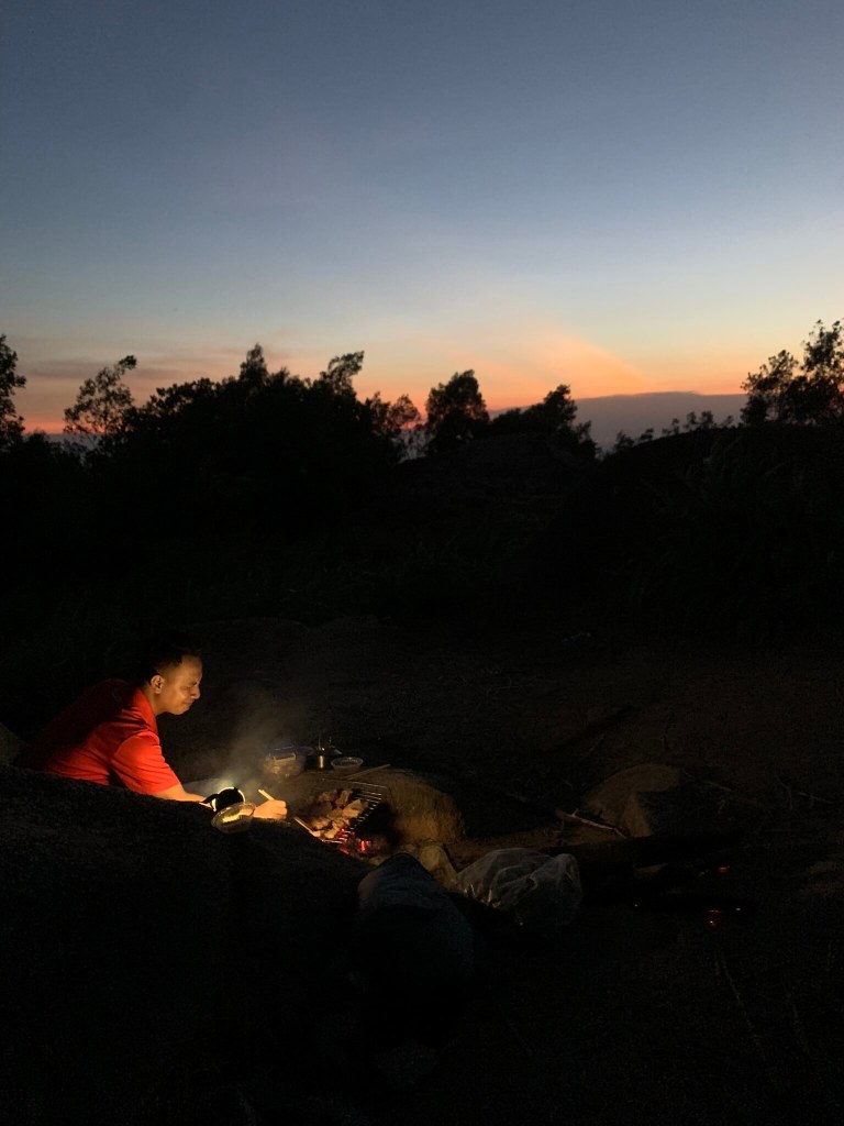 “Đẹp”, một rừng màu sắc xen kẽ nhau ánh lên trên nền trời đang dần tối. Mình bắt cái nồi nước lên pha trà vừa uống vừa ngắm hoàng hôn vừa uống, chill chill. Hiện tại có 1 cặp nam nữ đã dựng xong lều đang ăn nhẹ buổi tối bằng thức ăn nhanh chuẩn bị mang theo, 1 nhóm khác cũng đang tìm chỗ dựng lều; mình đi mời 4 người uống trà chung cho vui, sau đó bạn kia nói tối nay có gì giao lưu mang tới 2 lít vodka.