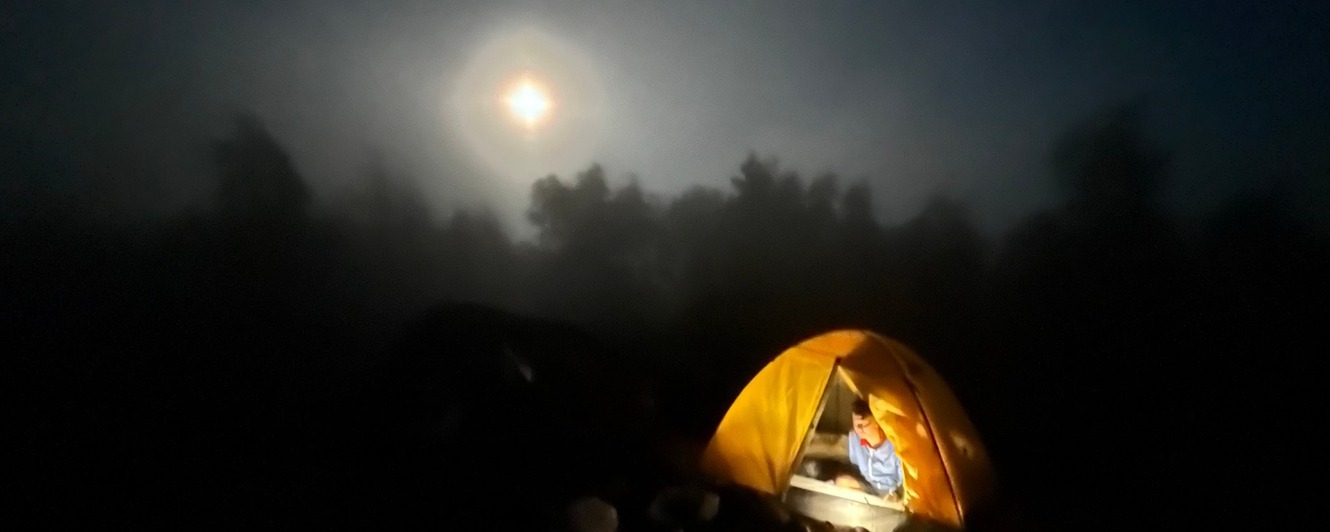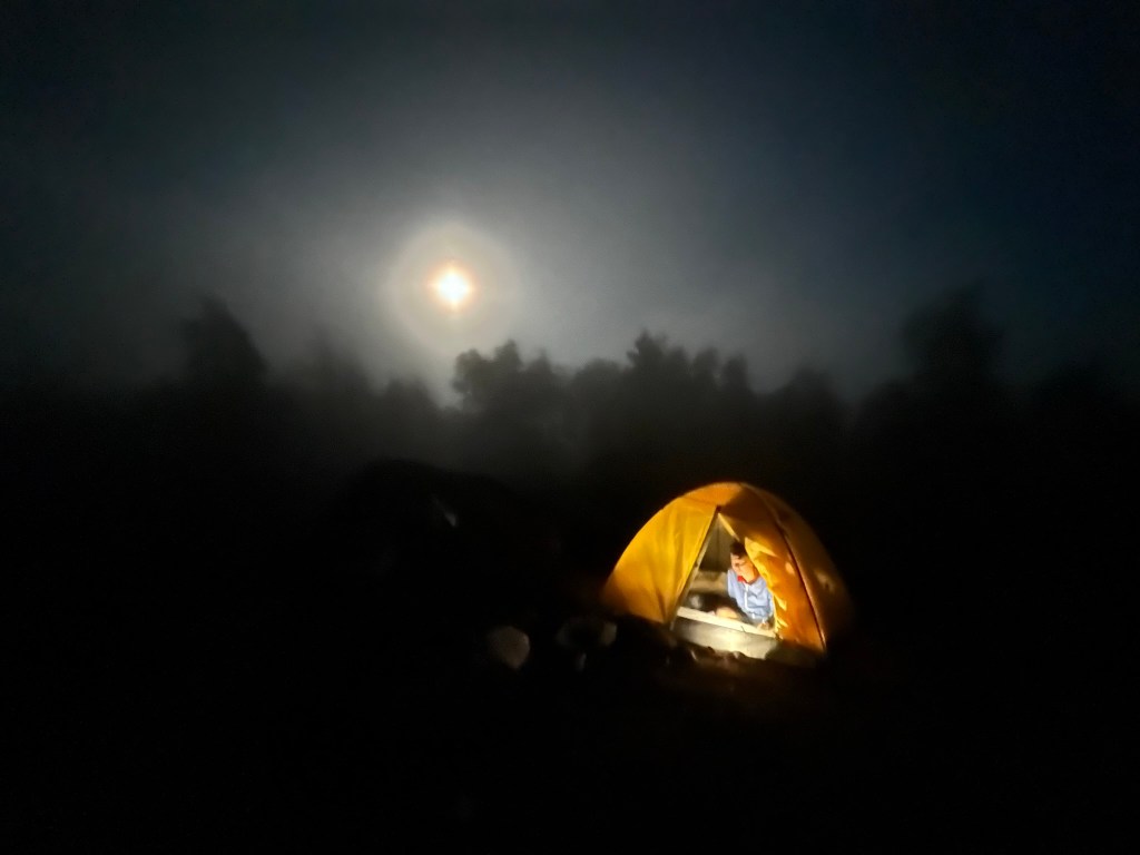 Mình mở lều ra để chửi vì chịu hết nổi rồi… Nhìn ra ngoài không có ai nữa, tụi nó về lều rồi.
