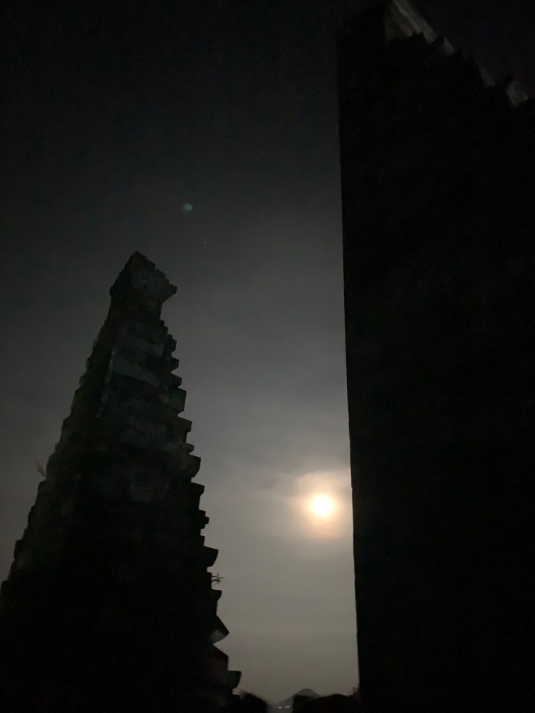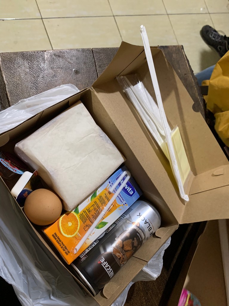 Lúc này 4h30 sáng, trời sáng do ánh trăng rực rỡ chiếu bên trên. Ngồi ăn li mì Pop Mie hơi dai cùng vị cari nồng, uống ly cà phê vẫn còn xác, tạo cảm giác lợn cợn khó chịu trong khoang miệng vì nó đã quen uống cà phê Việt Nam rồi.