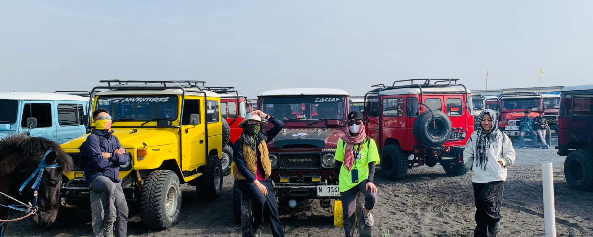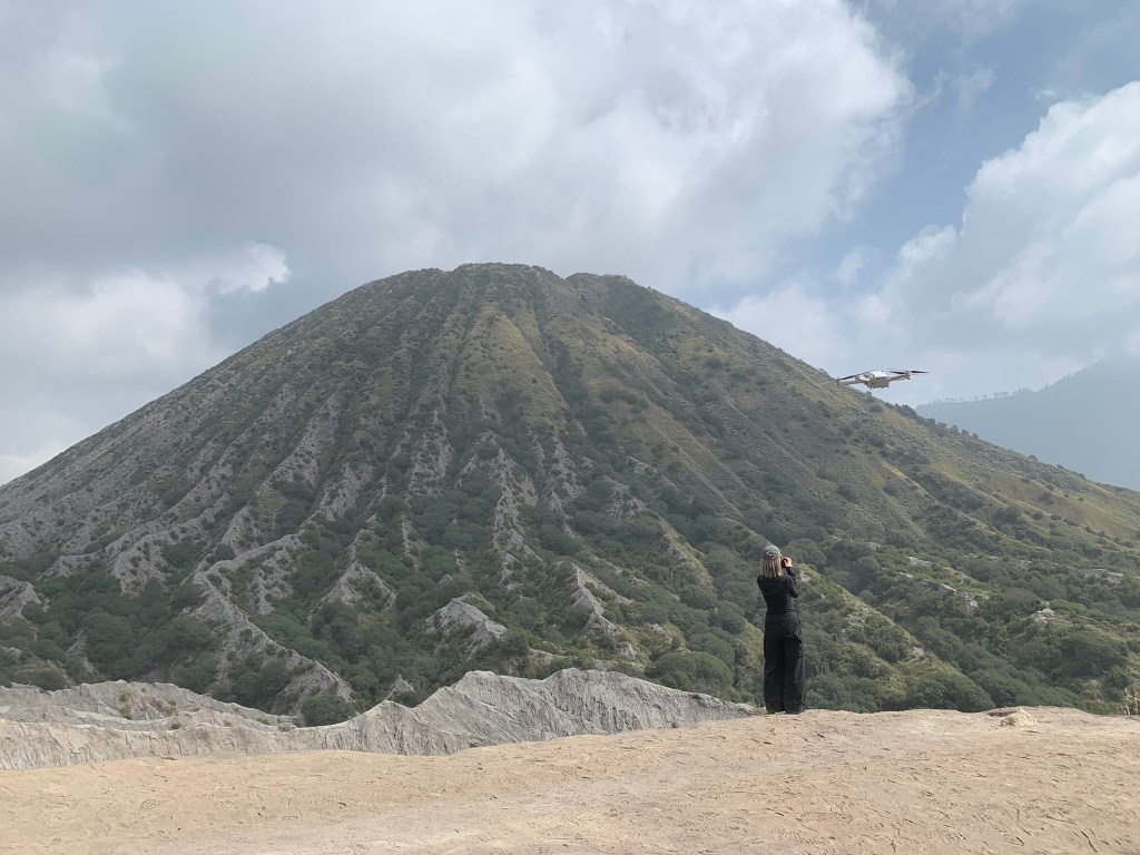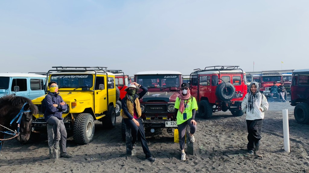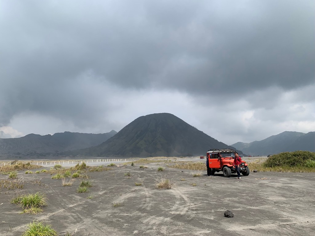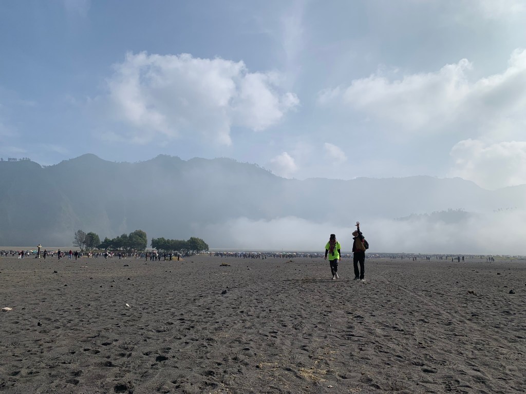 Trong đầu nó cứ nghĩ đi tham thú vậy là xong, ai dè xe chở đi qua “sa mạc đen” di chuyển lên ngắm khói cứ 15 phút bốc lên một lần trong miệng núi lửa Bromo. Chỗ này đất cát đen xì, nghe nói là bụi núi lửa rớt xuống nên nó có màu này, nhìn kĩ thì thấy cát cũng lấp lánh dưới ánh nắng mặt trời chắc có tinh thể sắt hay gì đó bên trong; nhưng với nó thì như đang ở bãi biển Cần Giờ chỉ không có núi thôi, thêm cái sạch hơn không có rác.