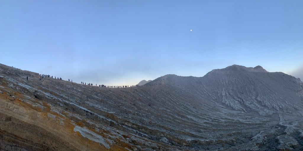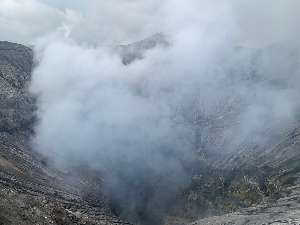 Chỗ này có dịch vụ cưỡi ngựa nhưng nó chọn đi bộ chỉ vì…nghèo, đợt này đổi tiền ít, đến khúc cuối nó còn mượn tiền bè bạn nữa, về còn đúng 26k Rupiah khoảng 40k tiền Viêt. Đi bộ khoảng 1.5km tới đỉnh rồi chỉ đứng chờ đi lên miệng hơi lâu do con đường chỉ đủ xếp 1 hàng đi lên và 1 hàng đi xuống thôi. Đây là lần đầu tiên nó nhìn thấy núi lửa vẫn còn hoạt động, cũng thích thú nhưng nhìn chỉ có vậy thôi, sau khi bị bảo vệ “nói nhẹ” về việc đứng quá gần chụp hình thì thôi nó xin phép đi xuống luôn.