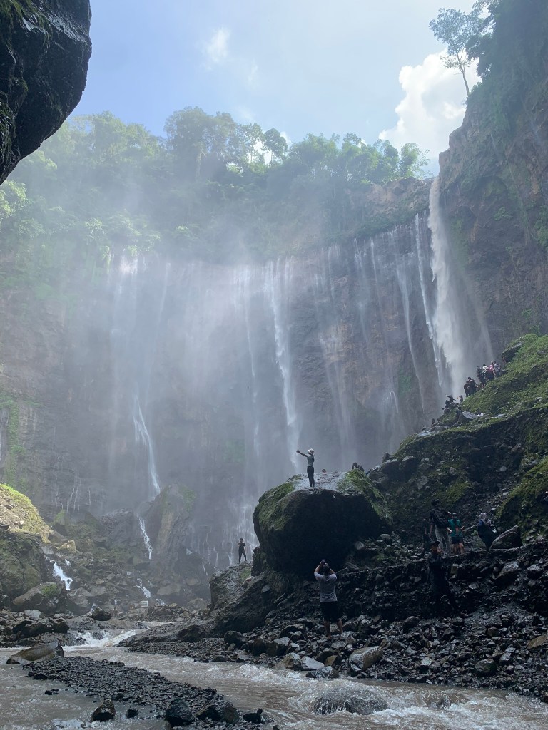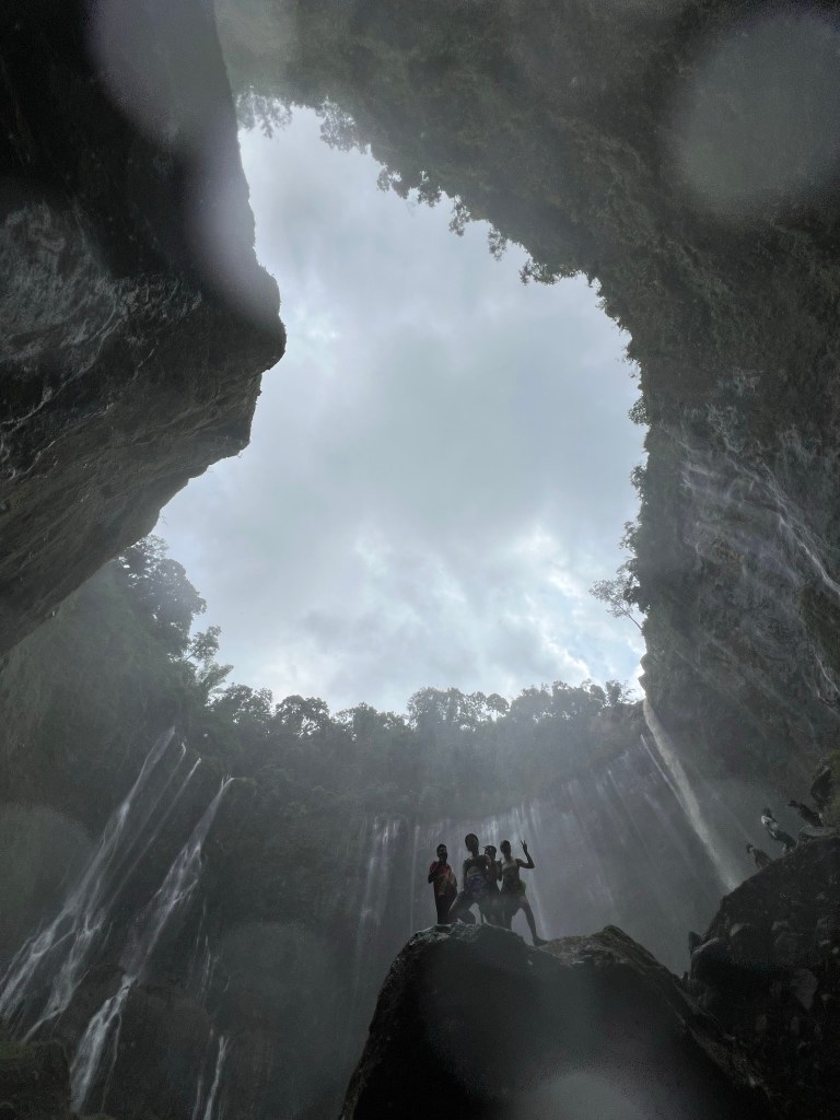 Thác Tumpak Sewu (Thousand Waterfalls) có 2 khu vực, thác lớn và thác nhỏ. Tụi nó sẽ được tham quan cả 2 địa điểm trong sáng nay. Đường đi xuống khá nhỏ nên nó phải chờ tín hiệu từ các bạn local hướng dẫn điều hành nhóm nào đi, nhóm nào không để tránh té ngã và ùn tắc cục bộ. Khoảng 30 phút thì tụi nó cũng tới được bên dưới, thác hùng vĩ, cao chắc khoảng 60-70m. Nhìn từ dưới lên, nó thấy mình thật nhỏ bé.