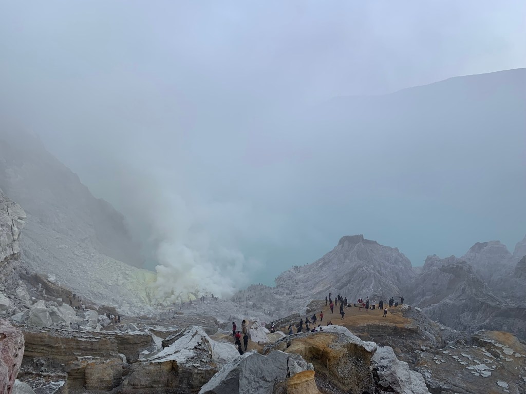 Trời sáng, màu vàng đậm đặc của lưu huỳnh mới hiển rõ bao lấy toàn bộ khu vực. Màu ngọc bích của hồ axit cũng rõ nét hơn, cái đẹp thật nguy hiểm.