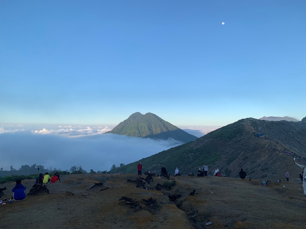 Điểm ngắm của nó tên là Seruni Point, còn 1 điểm khác Kingkong Point chỉ cần đi lên chút nữa nhưng nó thấy ở đây là quá hợp lí rồi. Người ta đi thì ngắm được ánh nắng chiếu xuyên qua rặng núi, sự sắc nét của từng rãnh chạy dọc từ dưới lên tới đỉnh núi, còn phiên bản “săn mây” hôm nay của nó thì là một mặt tương phản hoàn toàn, chỉ thấy mây trôi và những đỉnh núi như mấy cái “núm **” trồi lên khỏi đám bông gòn vậy. Ngồi chờ tới 7h để coi nó có khác gì không…nó nói “éo”, chịu rồi, đi xuống thôi.