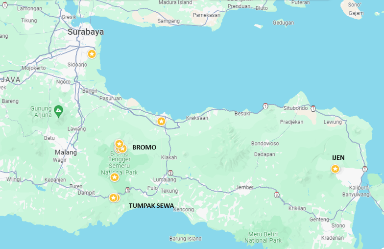 3 địa điểm nó được đưa tới đều nằm bờ đông của đảo Java, East Java: Núi lửa Bromo, Thác Tumpak Sewu và Hồ Ijen. Núi lửa Bromo- Tumpak Sewu (91km); Tumpak Sewu – Ijen (250km)