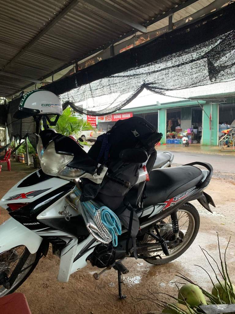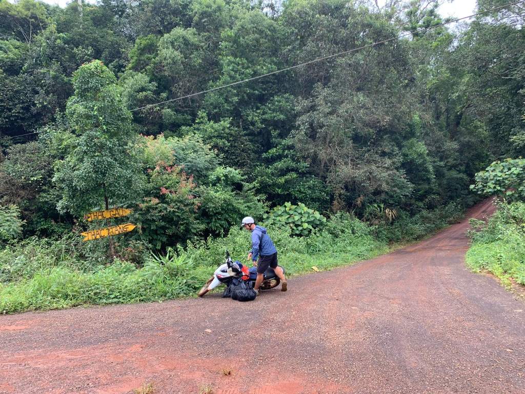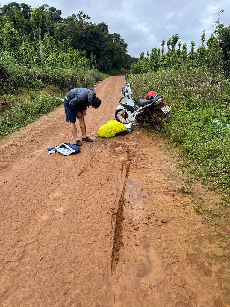 Nó lên xe, kiểm tra bánh trước bánh sau, nổ máy lên ga, chạy chưa được 5m bánh lắc điên, thắng không ăn, thêm cái té nữa. “Xe hư mợ rồi, giờ sao ra khỏi rừng đây” chỗ này cách con đường xa lộ 3-4km, còn 1km thì tới con thác dựng lều cắm trại.