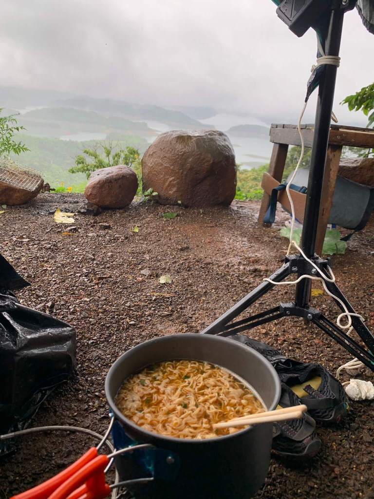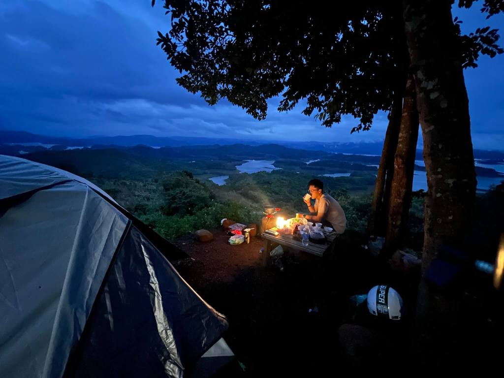 Thịt nướng đã dậy mùi thơm, ăn kèm muối tiêu chanh, uống chút rượu, đàm đạo chuyện trên trời dưới đất; chắc chắn đây là view cắm trại tuyệt vời nhất từ trước tới nay của nó rồi.