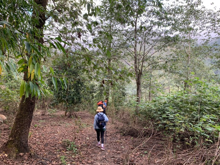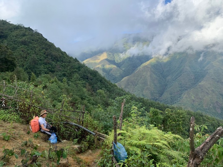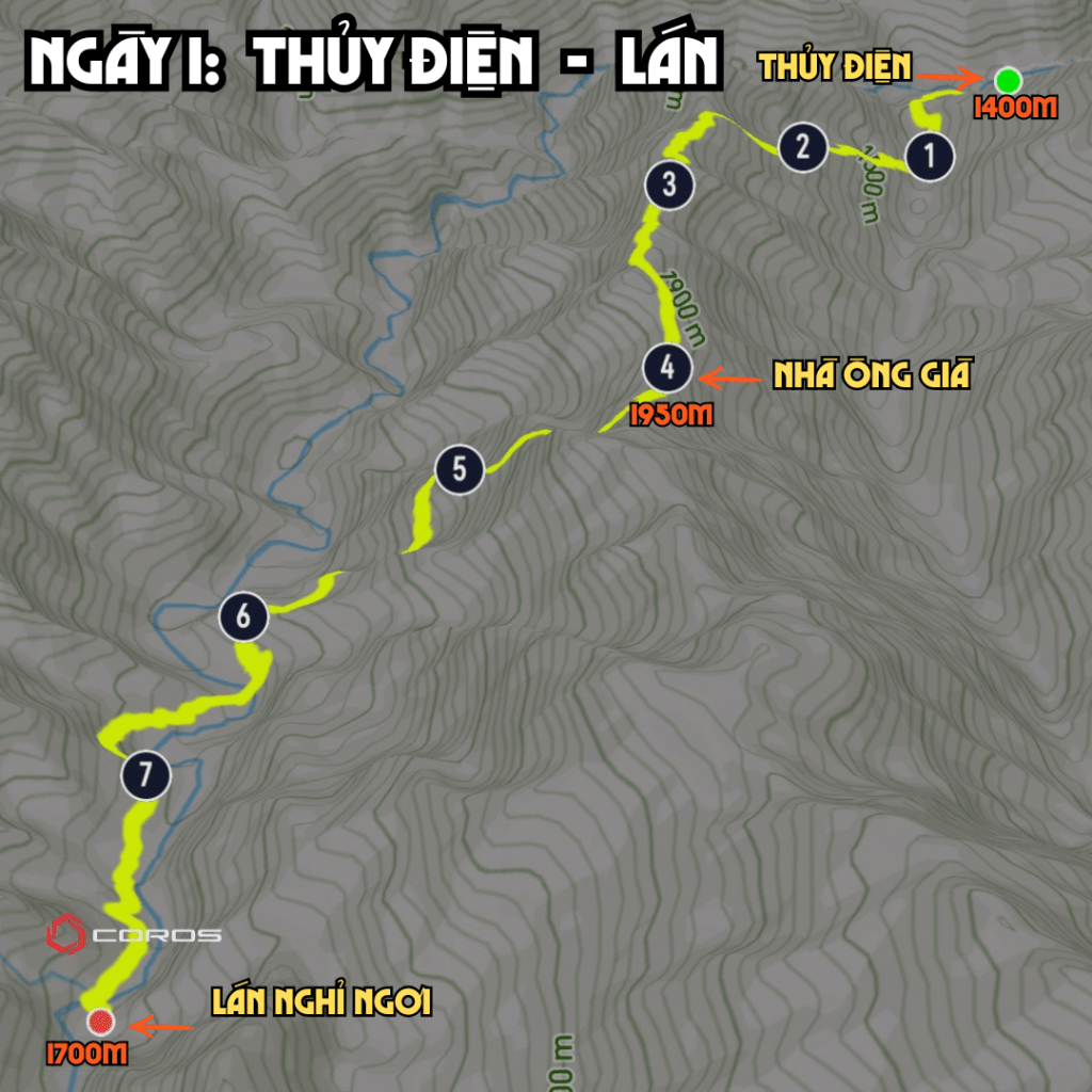 Nó chia quãng đường 8km hôm nay thành 2 đoạn: 4km lên dốc liên tục (1400m lên 1950m) tới nhà của Ông Bà Già người dân tộc Dao; 4km đi xuống địa điểm lán trại (1950m xuống 1700m).