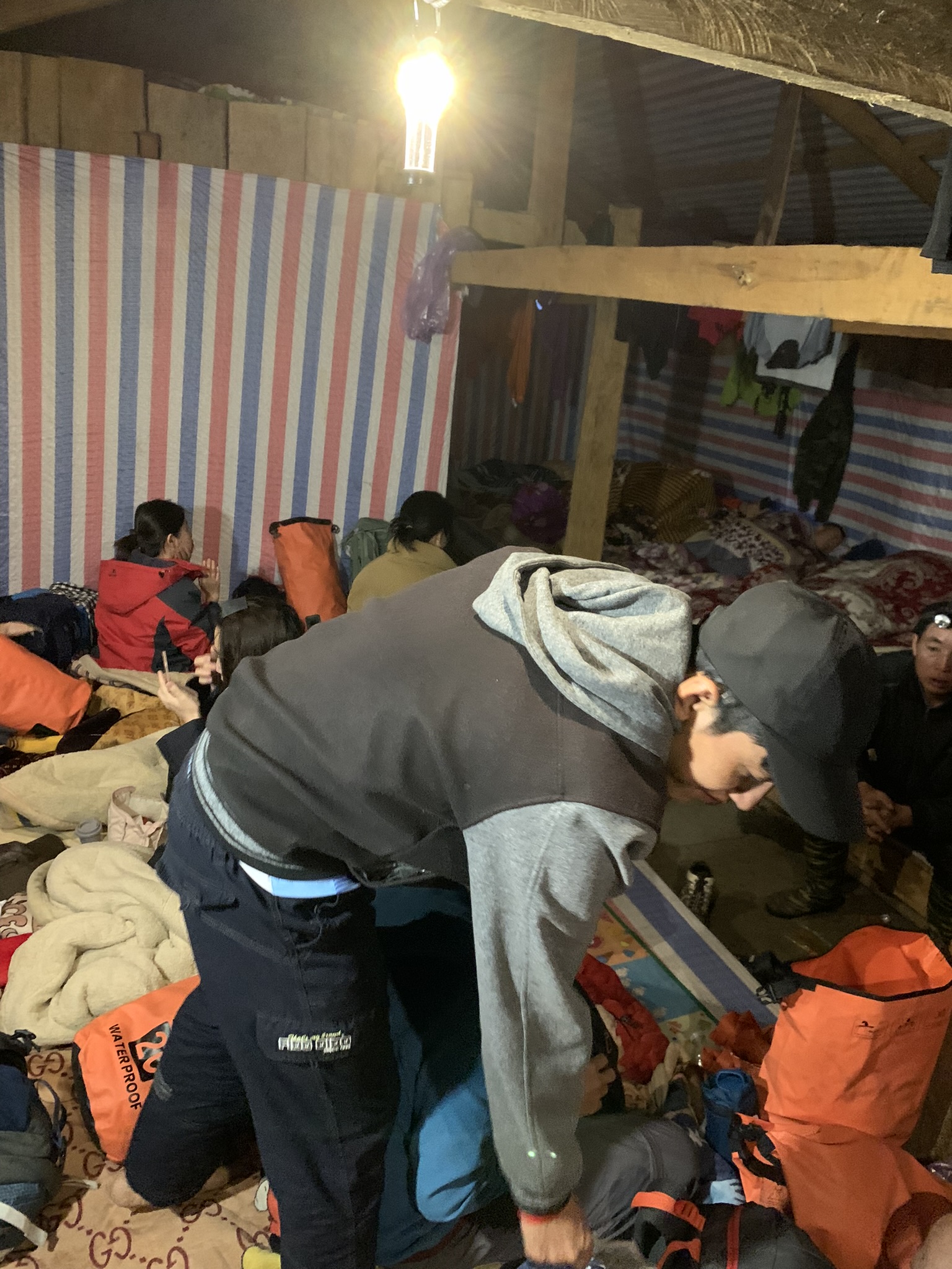 Lán có 2 căn nhà, một căn để du khách ở lại ngủ theo nó thấy thì sức chứa cũng khoảng 30 người, còn 1 căn bếp. 2 căn nhà xếp với nhau tạo thành chữ L. Ngoài ra có 2 nhà vệ sinh khá sạch sẽ, nếu bạn muốn sử dụng nước thì 1 xô 50k. Khi bước vào lán được chia làm 2 dãy nằm, có 1 con đường duy nhất đi giữa, 2 đoàn khác gần 15 người đã tới và nằm nghỉ ngơi, họ đang chờ buổi tối chuẩn bị xong là đi ăn luôn. Về 2 căn nhà này, theo nó biết thì trước đây không có mà chỉ là một nhà tạm để đồ đạc và chỗ để mọi người nấu ăn thôi. Mọi người sẽ mang lều theo để ngủ, từ 2022 có nhà đầu tư xây lên cái nhà này, sau này mỗi nhóm tới đều phải đăng kí và trả phí nếu ở lại.